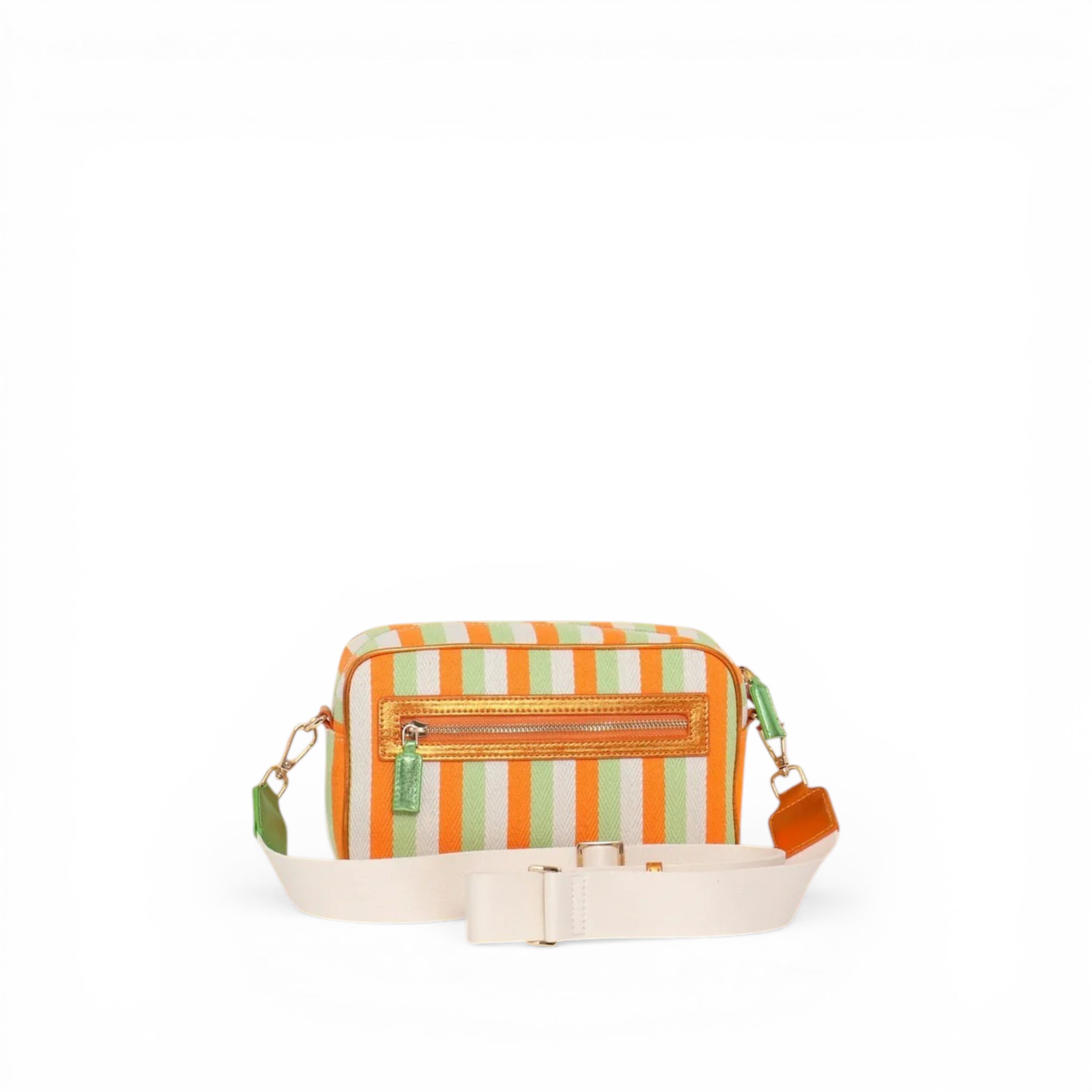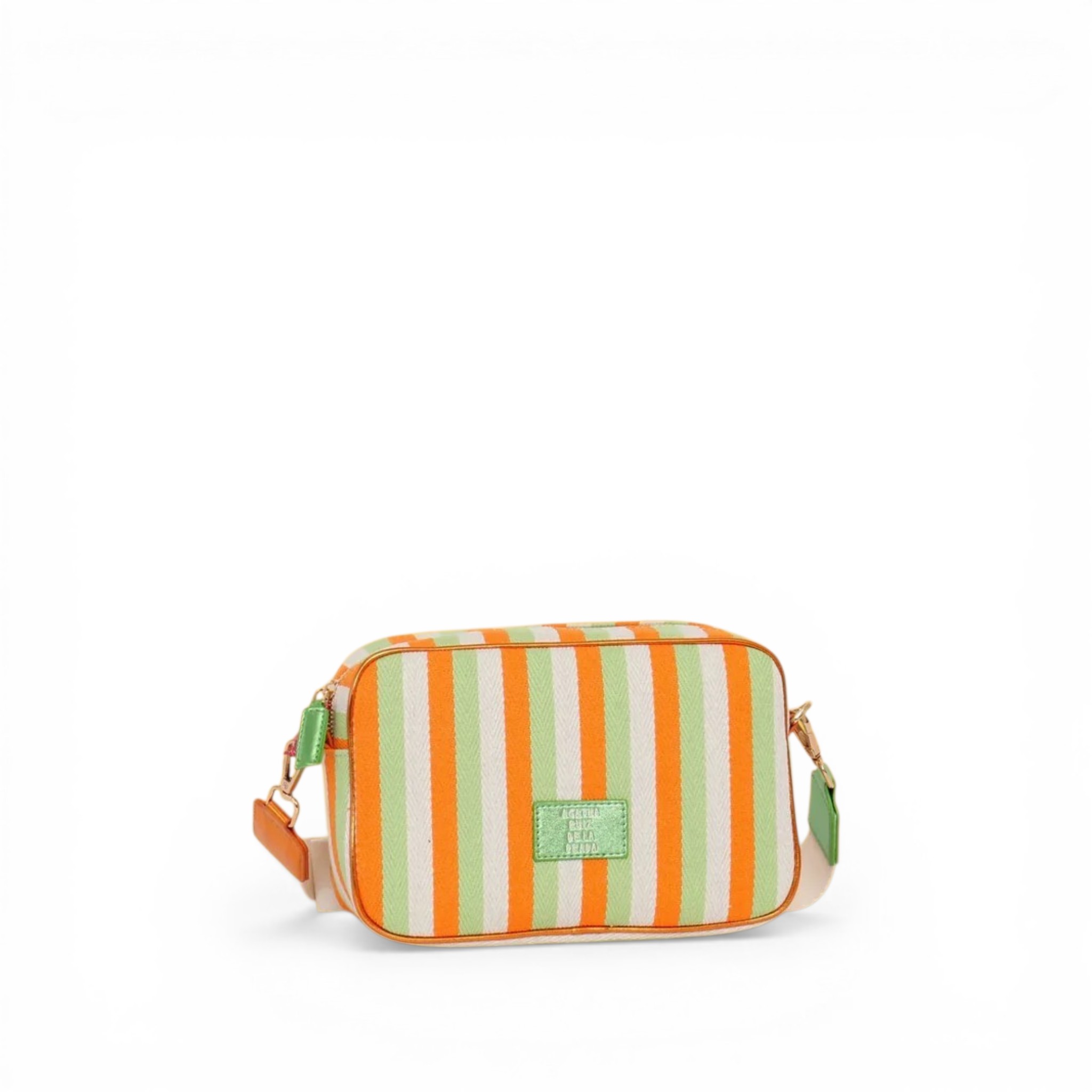 Bandolera de lona con estampado de rayas, de la marca Ágatha Ruiz de la Prada, confeccionado en lona resistente con un diseño de líneas en naranja que le aporta un toque moderno y vibrante. Interior forrado con un compartimento y bolsillo exterior trasero. Asa ancha ajustable.