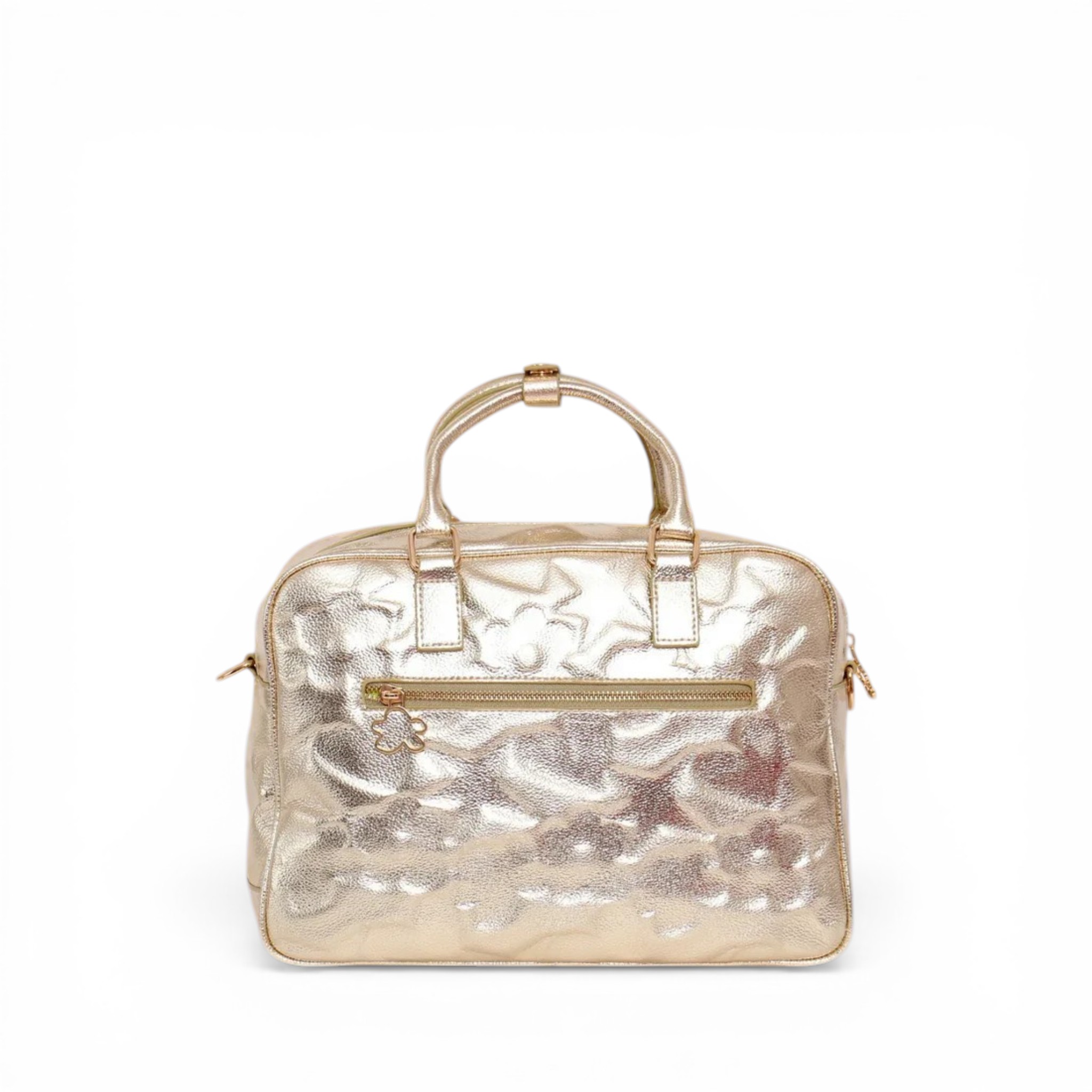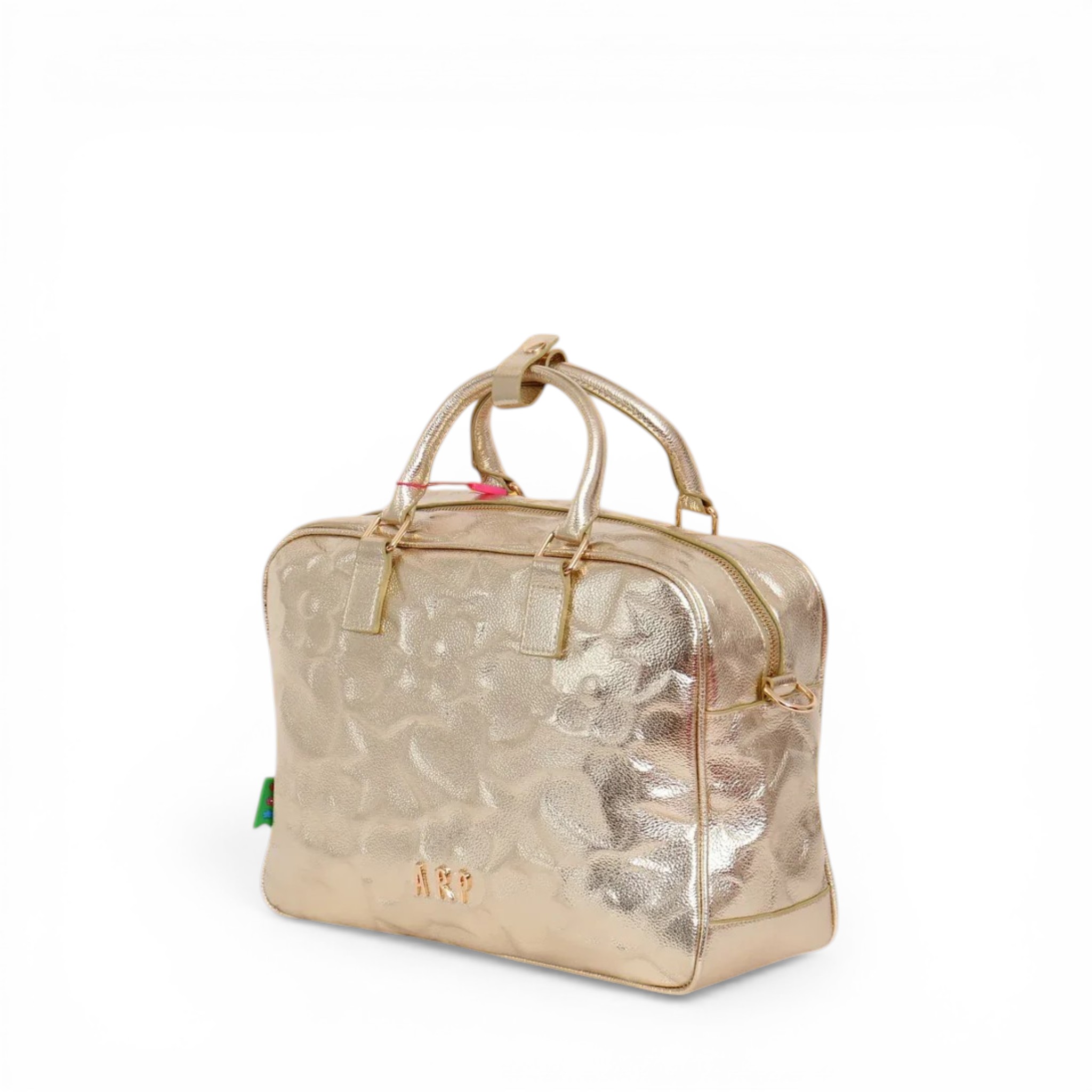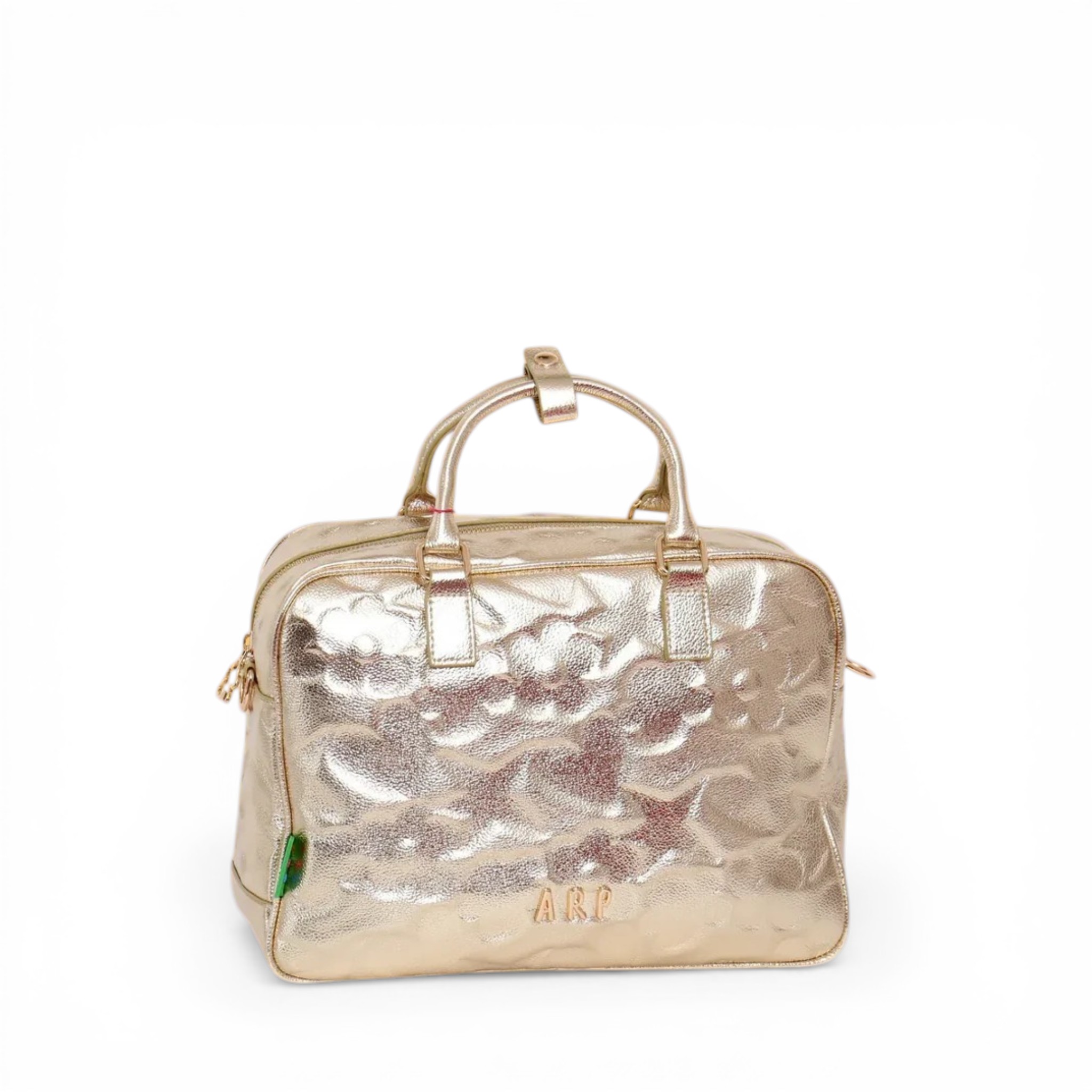 Bolso de la marca Ágatha Ruiz de la Prada, con flores, corazones y estrellas grabados en color oro metalizado. Incluye asa ajustable para bandolera. Medidas: alto 22, ancho 31, fondo 12 cm.