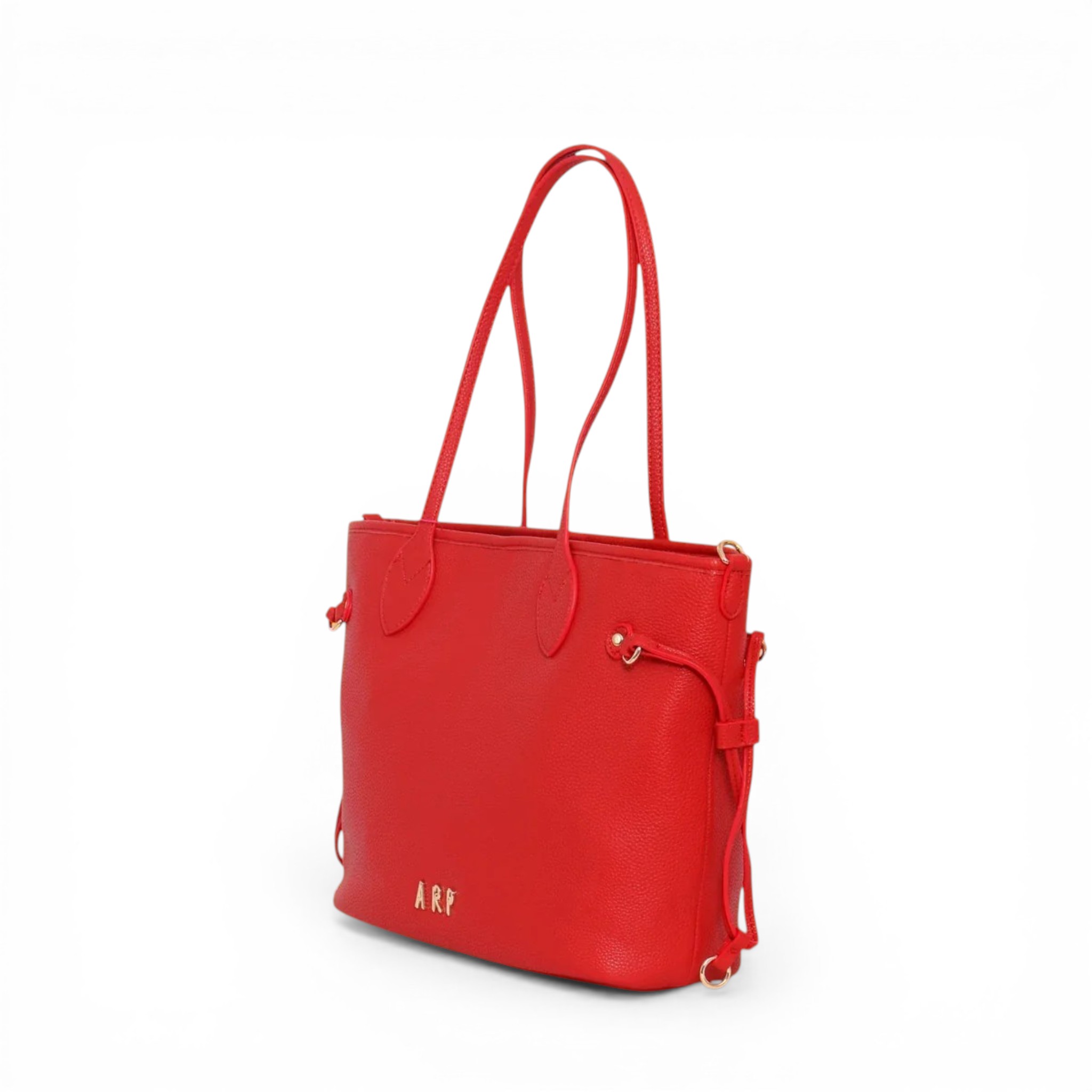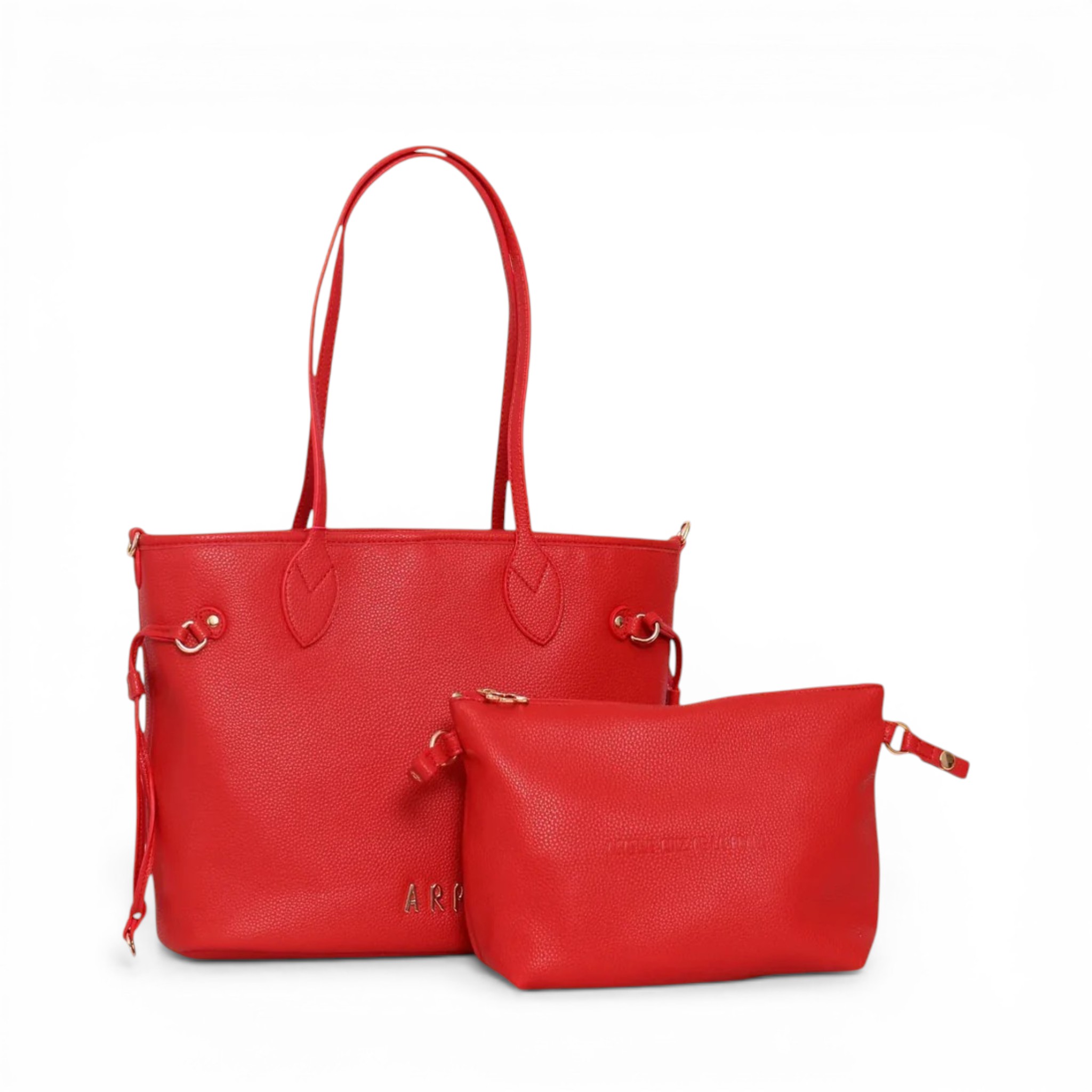 Shopper con efecto piel de color rojo de la marca Ágatha Ruiz de la Prada. Neceser en el interior. Asa ajustable. Medidas: alto 27cm, ancho 32 cm, fondo 13 cm.
