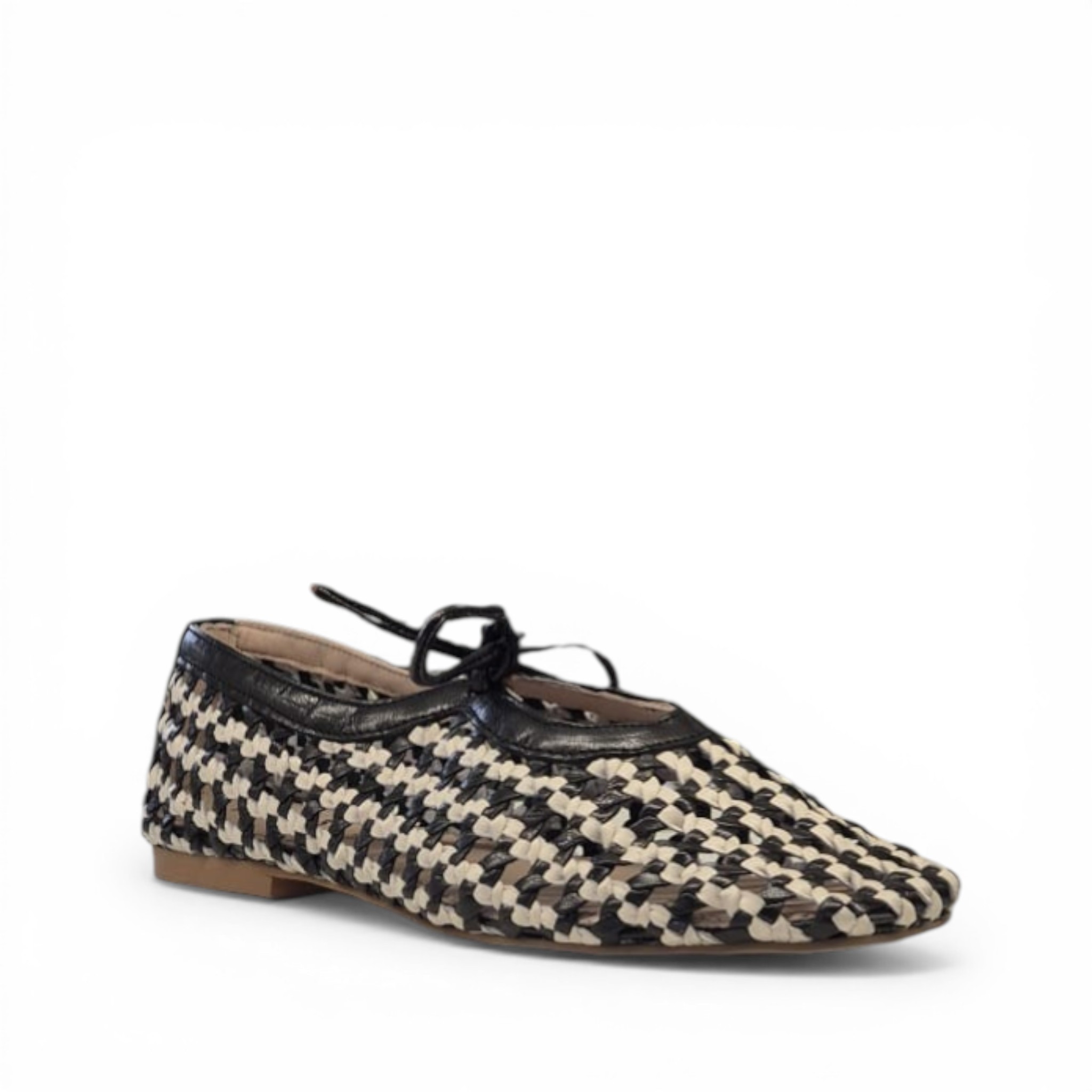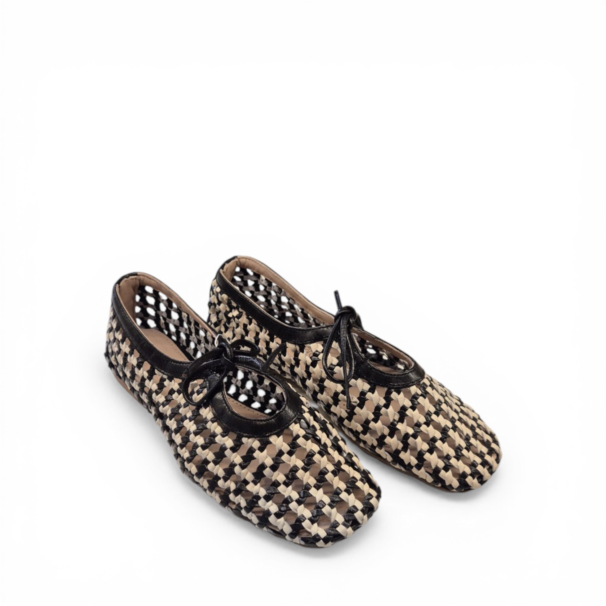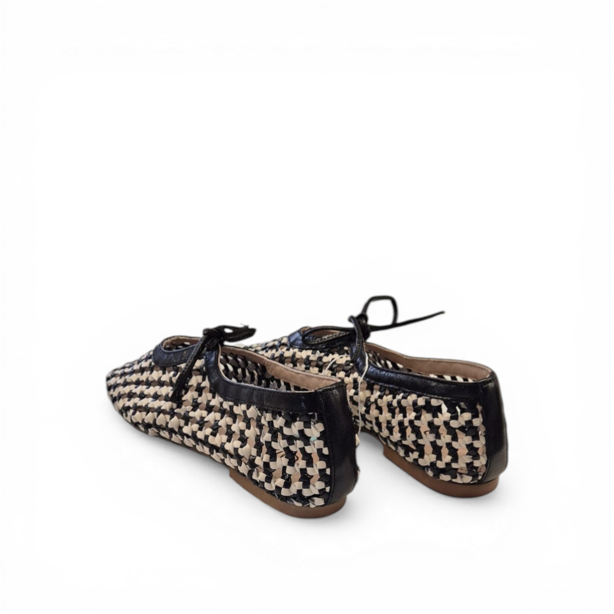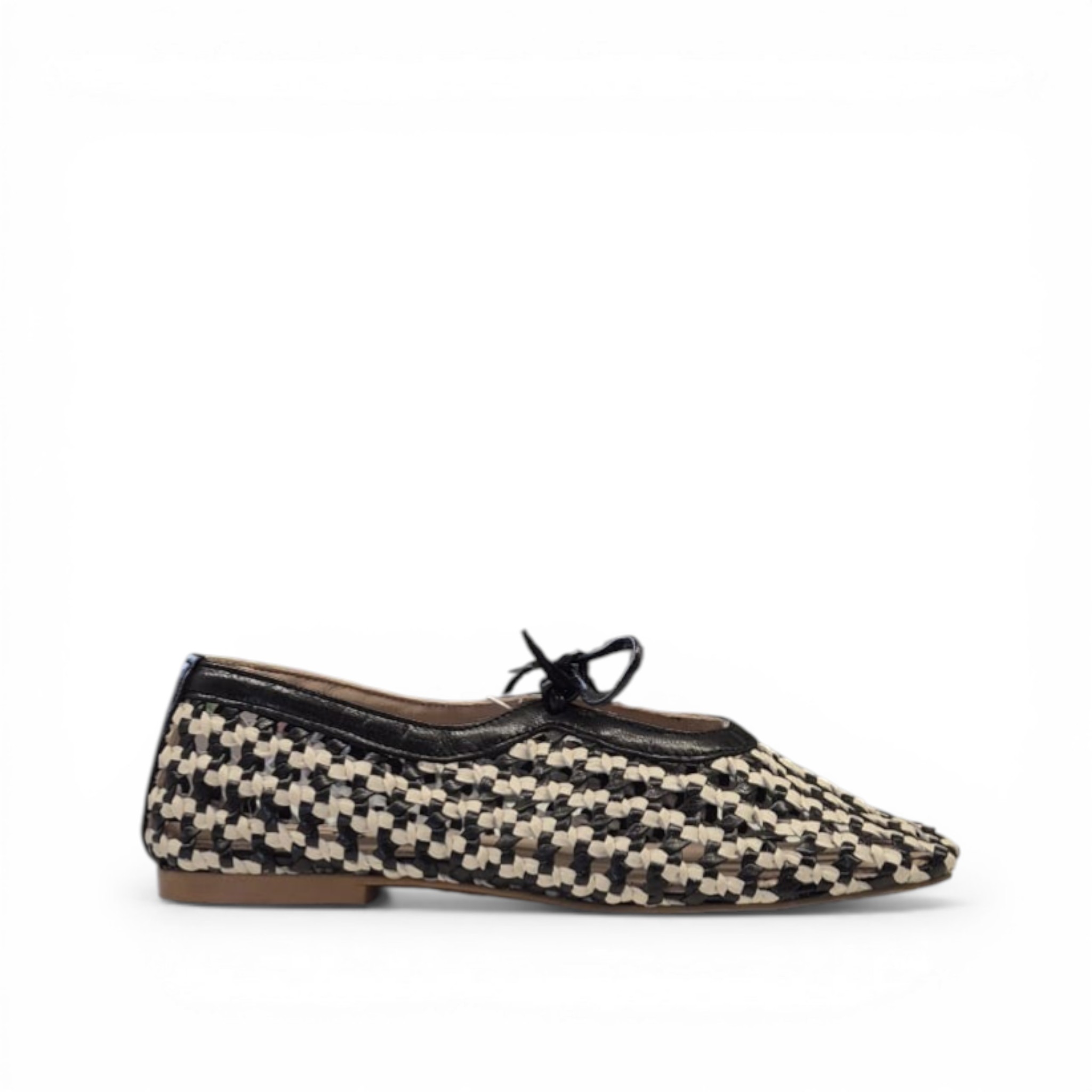 Bailarina crochet combinado blanco y negro con lazo en el empeine.