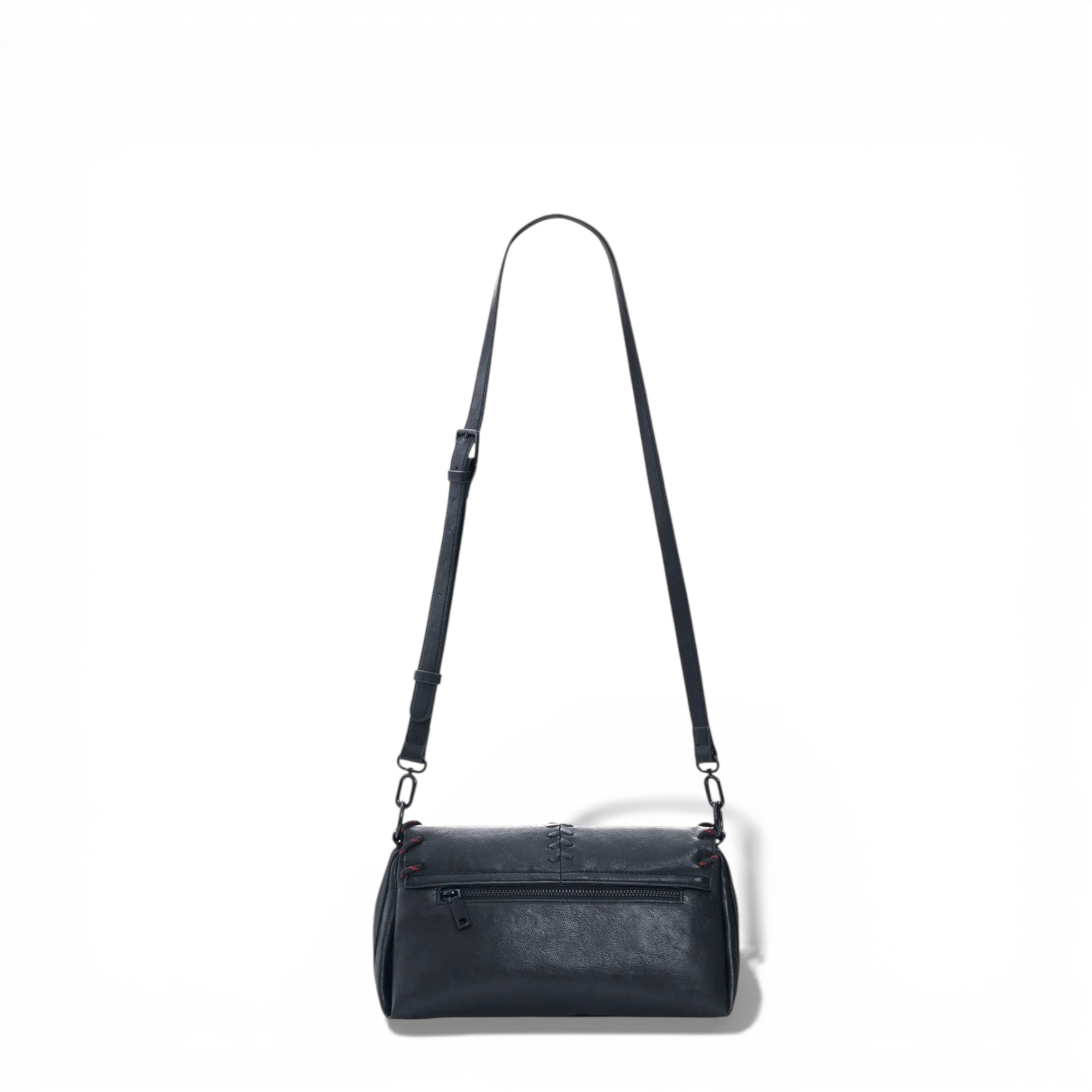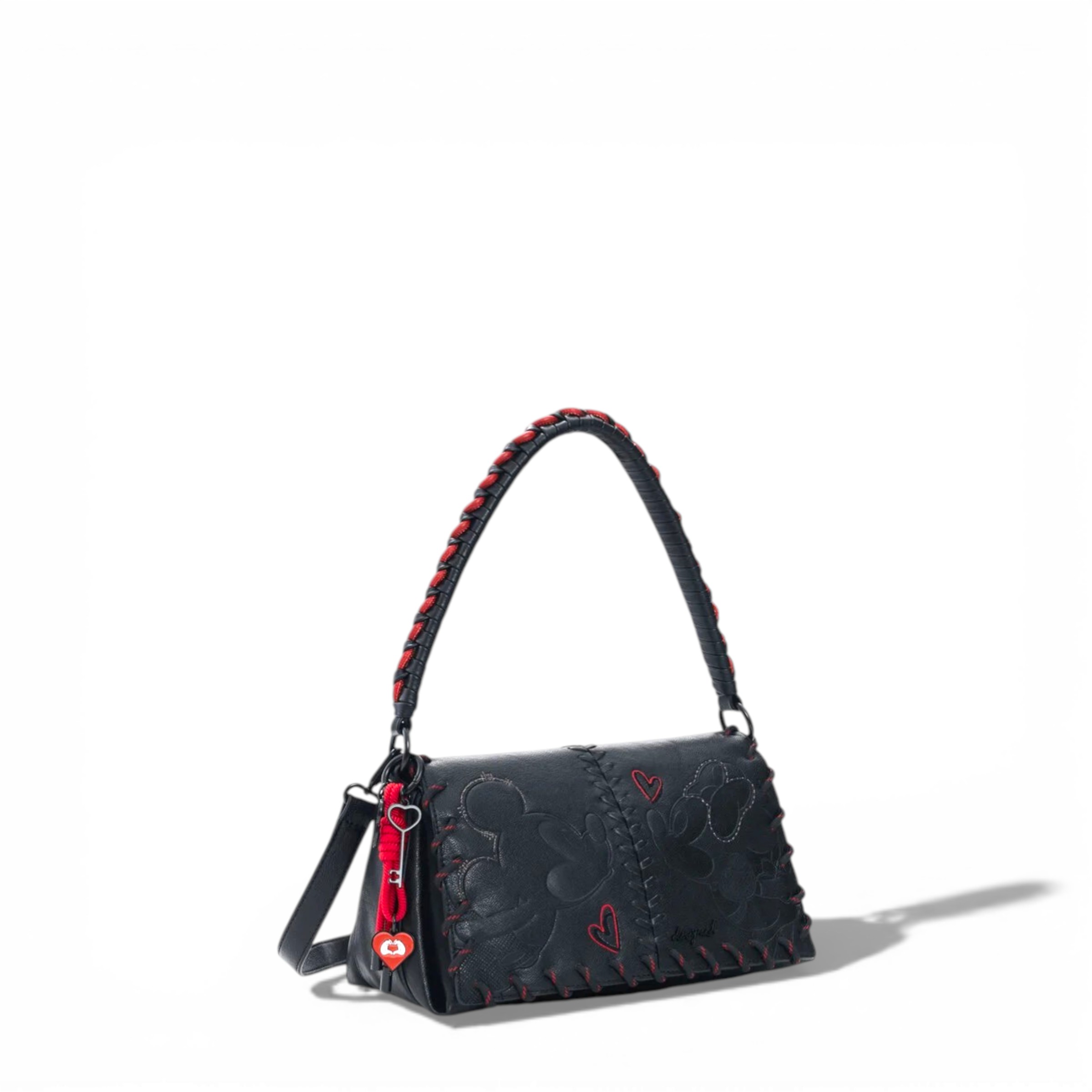 Bolso tipo bandolera en color negro con cierre de solapa y diseño con detalles en relieve. Asa corta trenzada y correa larga ajustable. Superficie texturizada con aplicaciones decorativas y contraste rojo en los laterales.