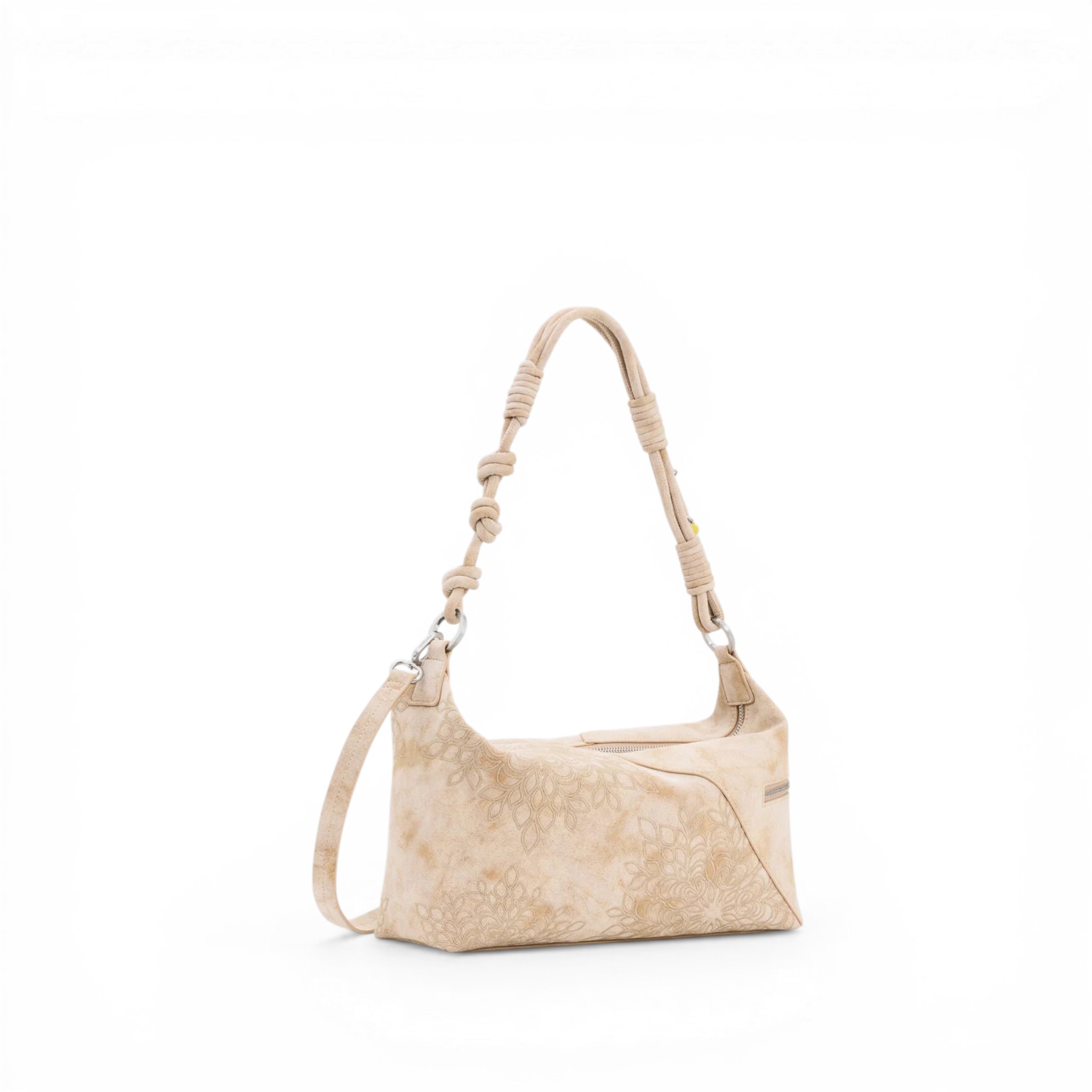 Bolso mediano con detalles bordados de la marca Desigual, bolsillo exterior con cremallera, logo metálico grabado y correas intercambiables.