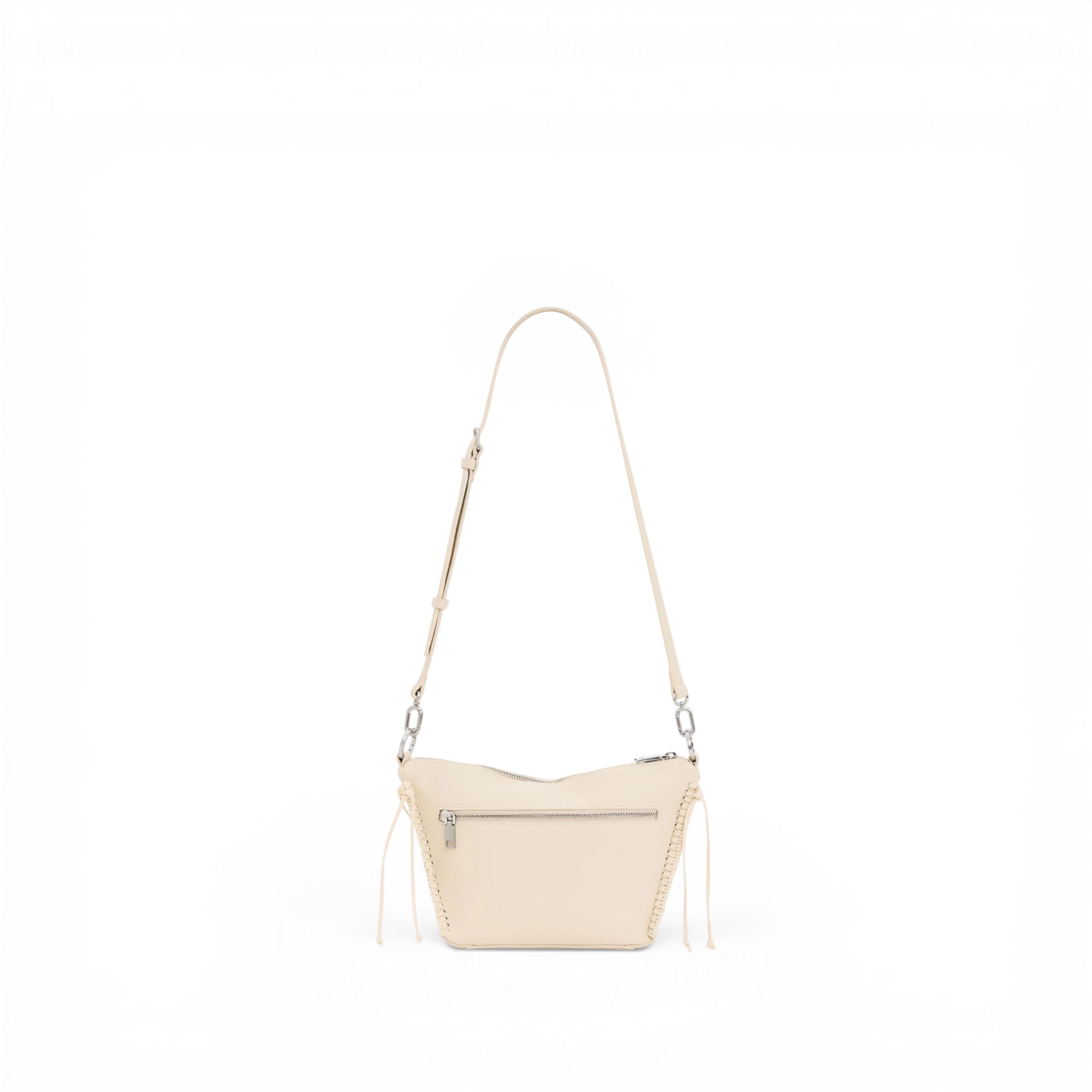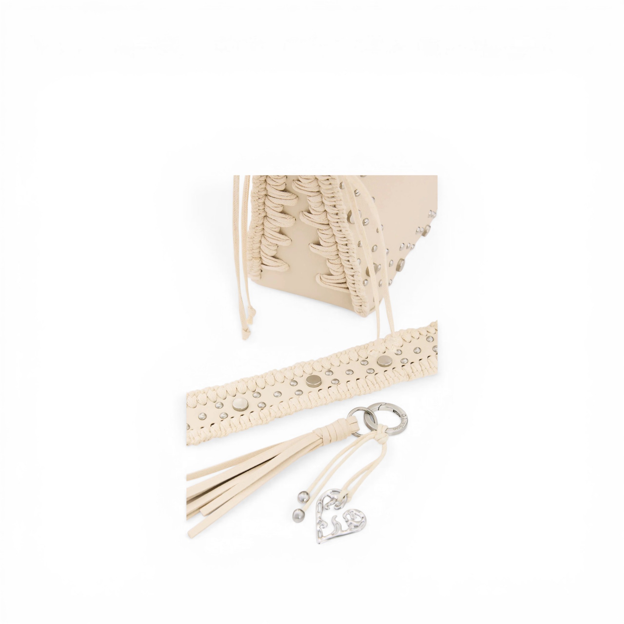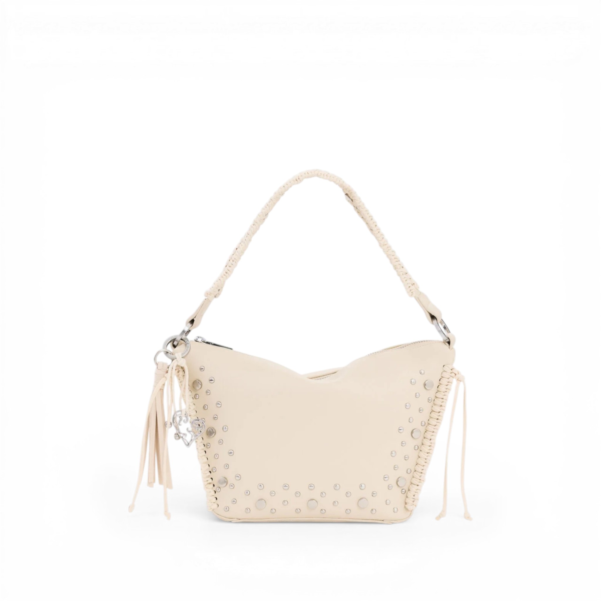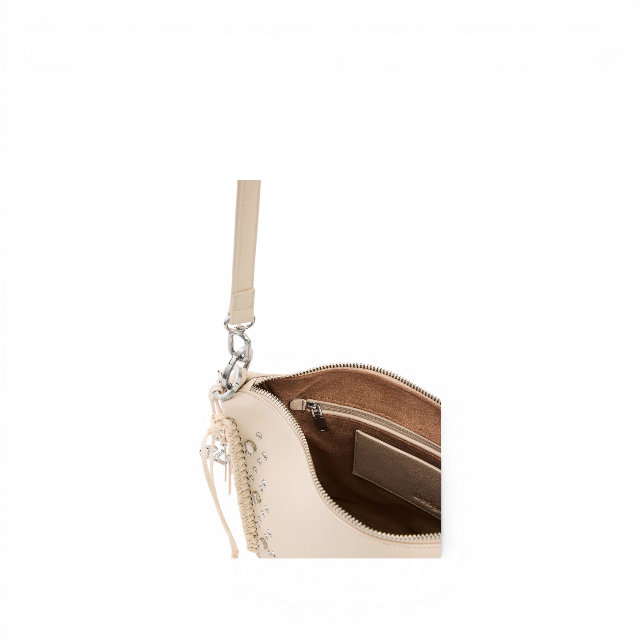 Bolso mediano de la marca Desigual, con correas intercambiables, una corta y otra de estilo bandolera, detalles de tachuelas metálicas y flecos