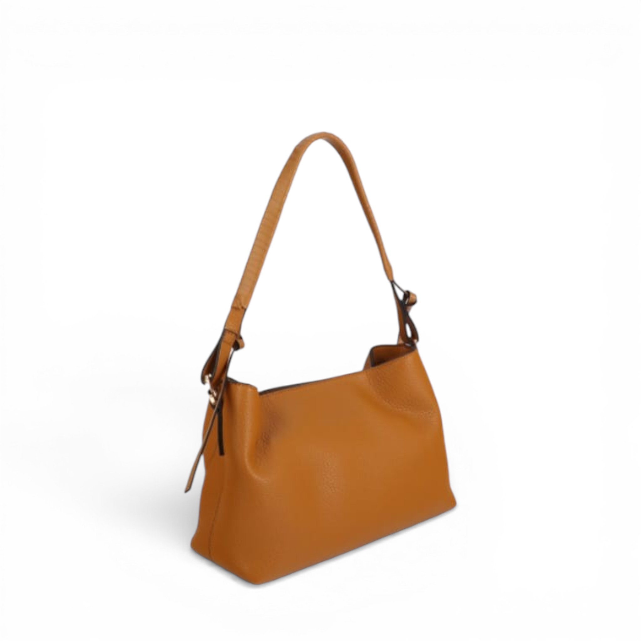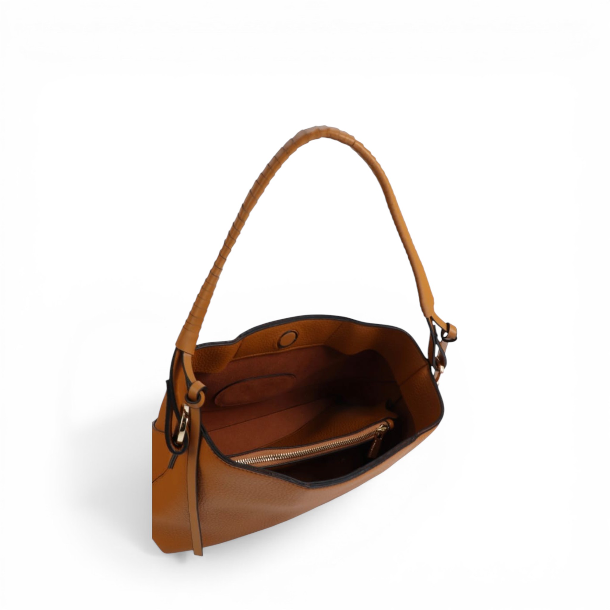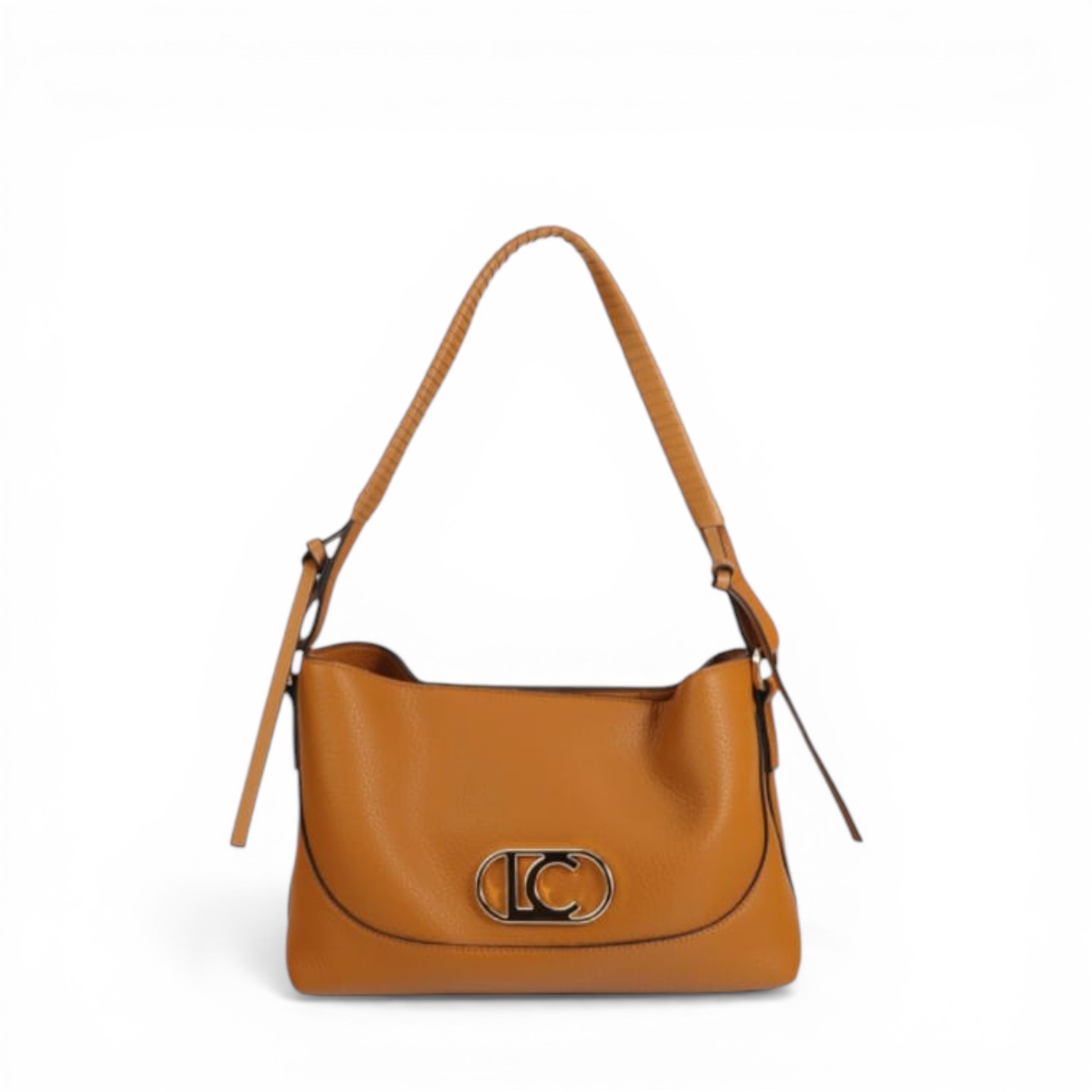 Bandolera con efecto piel de color camel de la marca Lola Casademunt. Presenta un asa trenzada de diseño único y detalle de lazada. Cierre con imán.