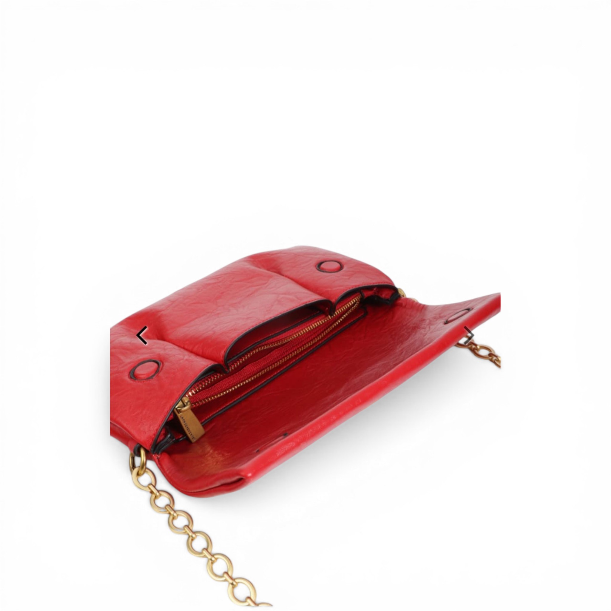 Bandolera con solapa de pliegues en color rojo de la marca Lola Casademunt. Cadena dorada desmontable para un estilo versátil. Logotipo frontal dorado y cierre magnético. Medidas: alto 16 cm, ancho 26,5 cm y profundidad 3 cm.