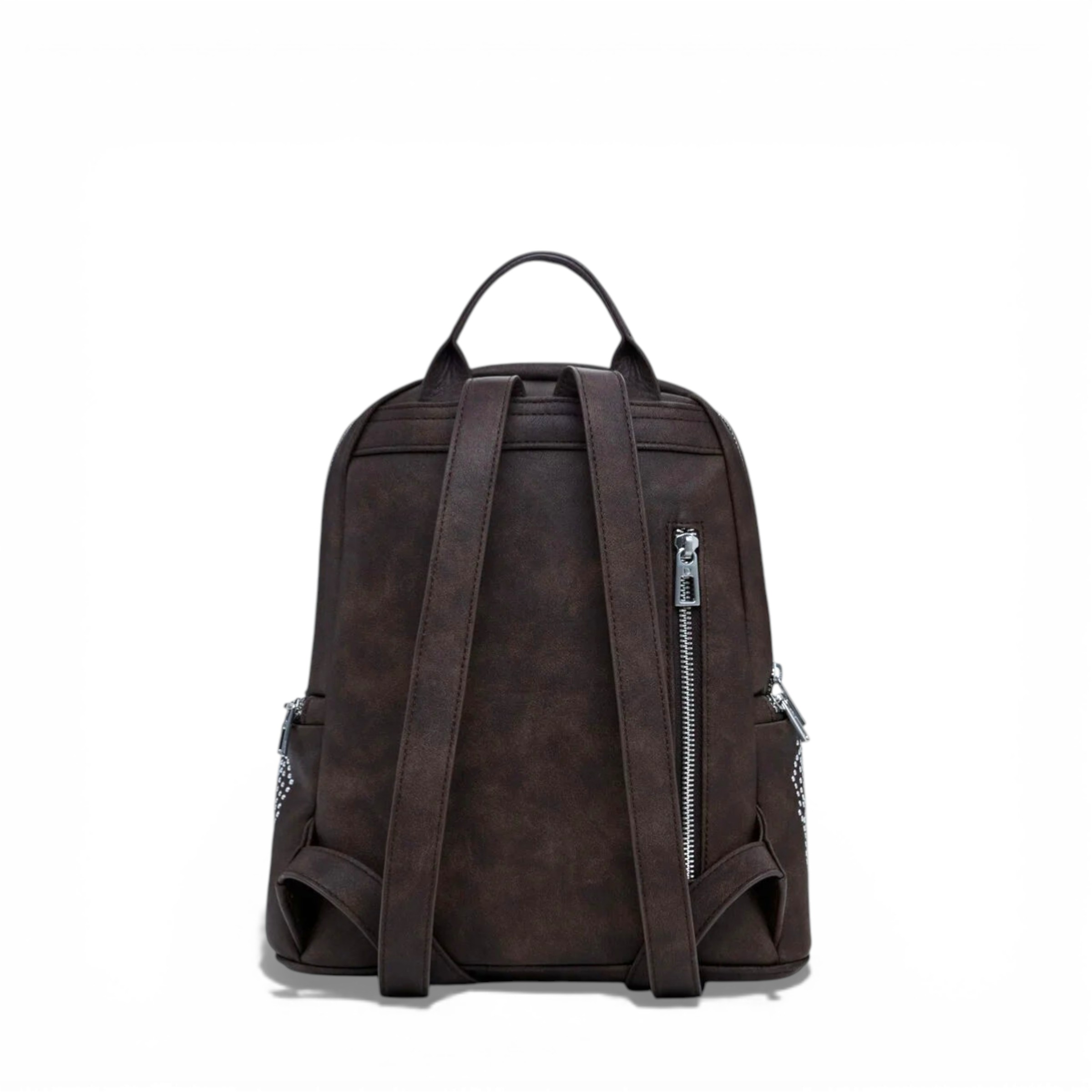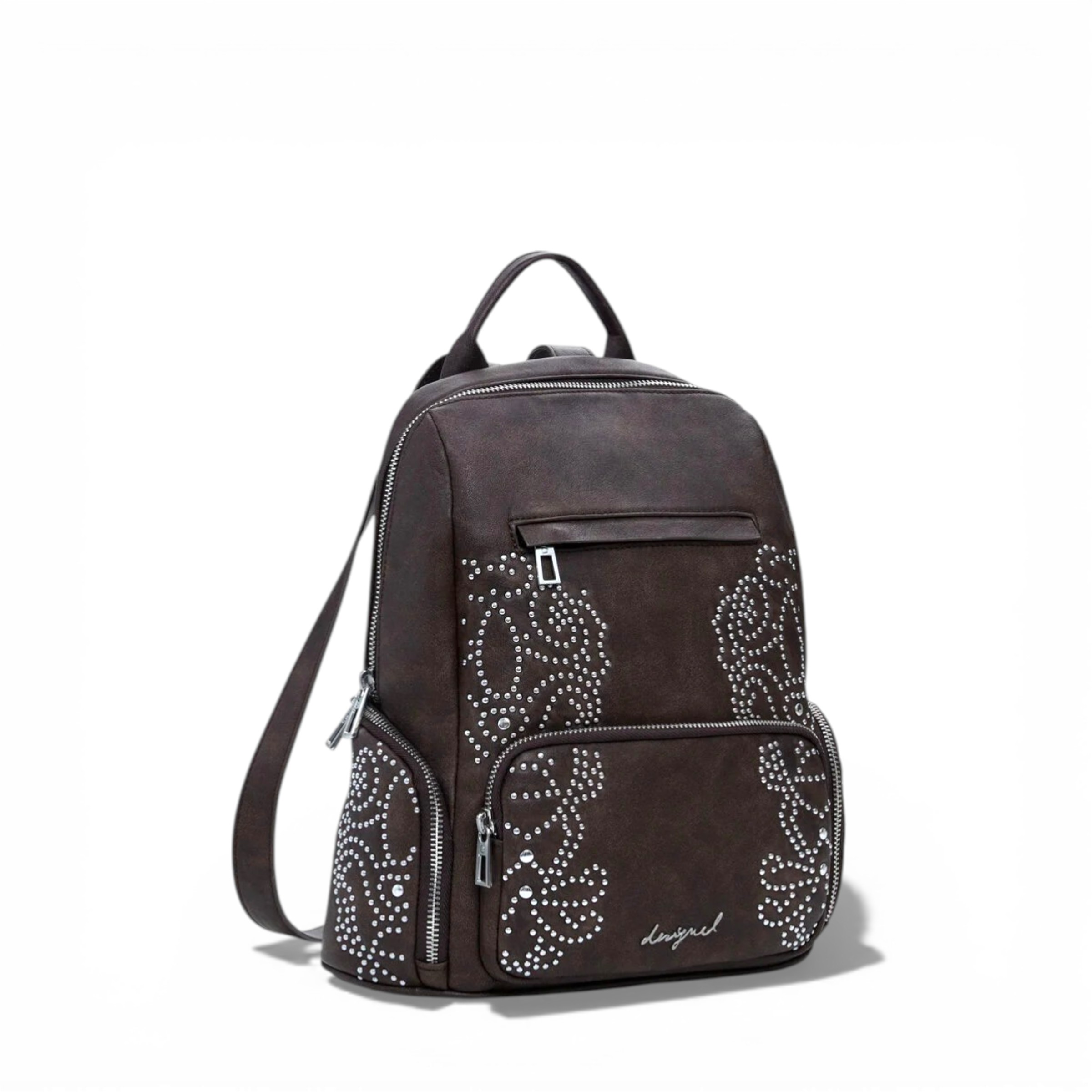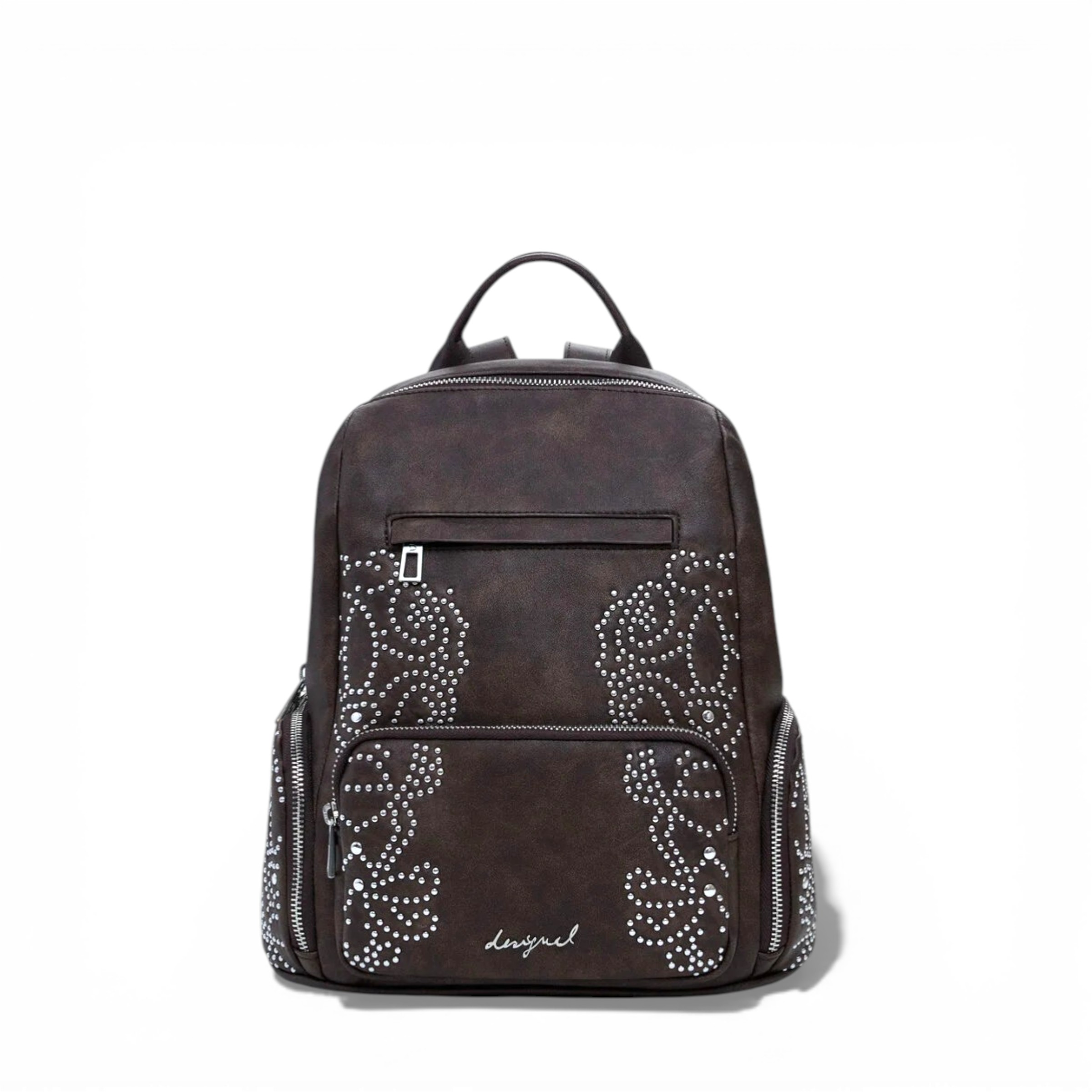 Mochila con efecto piel, con múltiples bolsillos exteriores y detalles de apliques de tachas metálicas.
