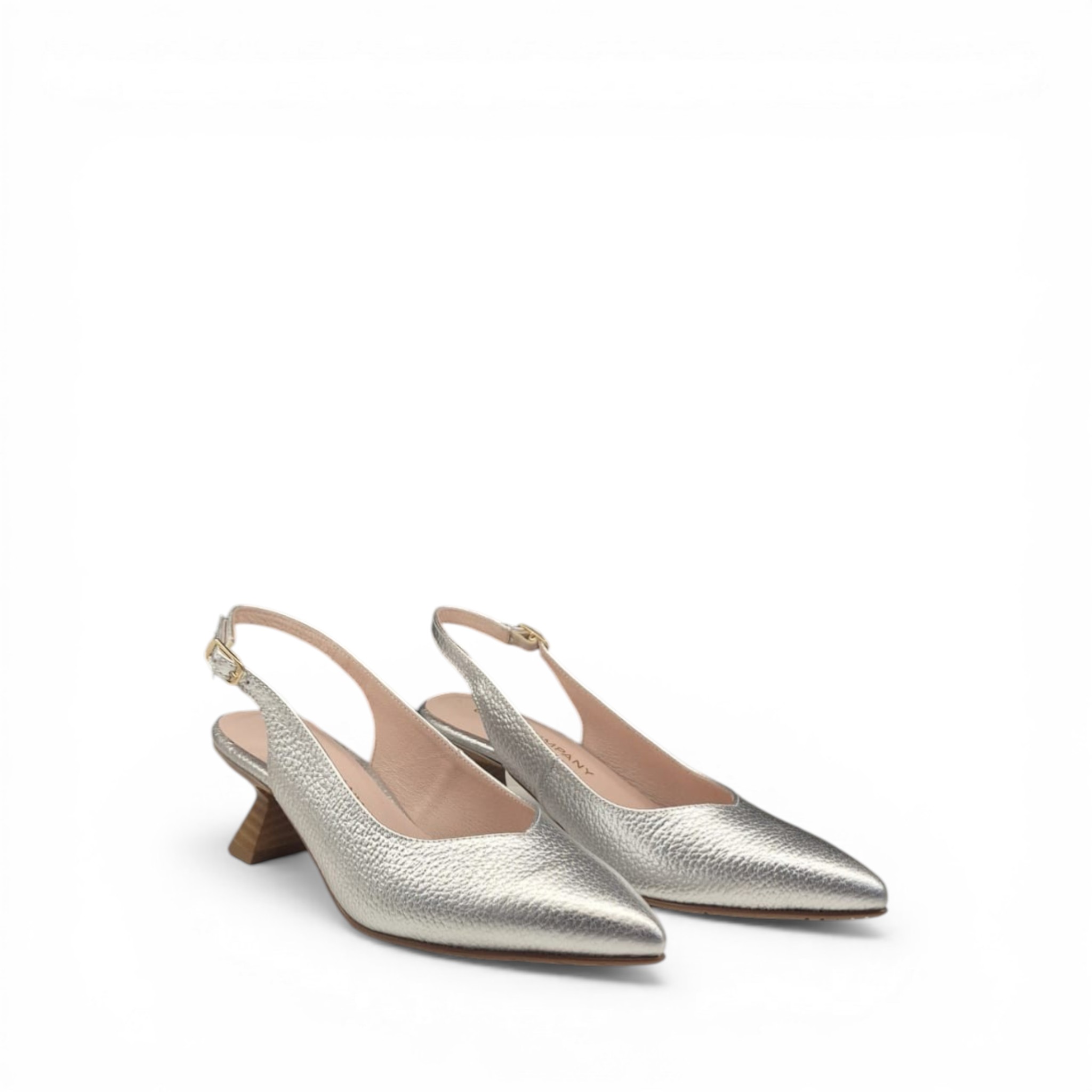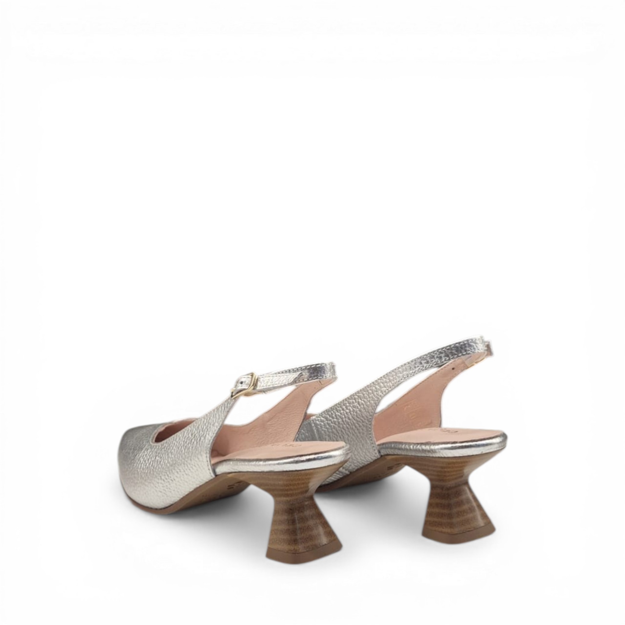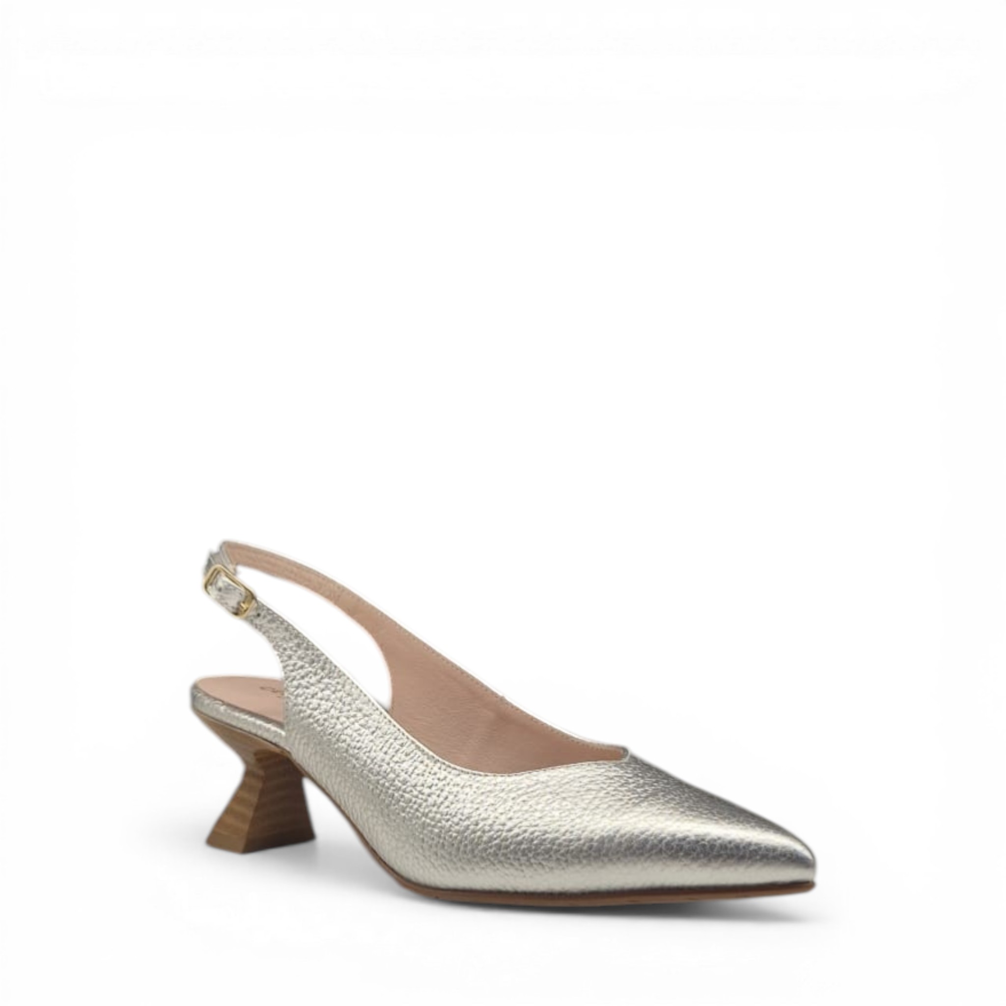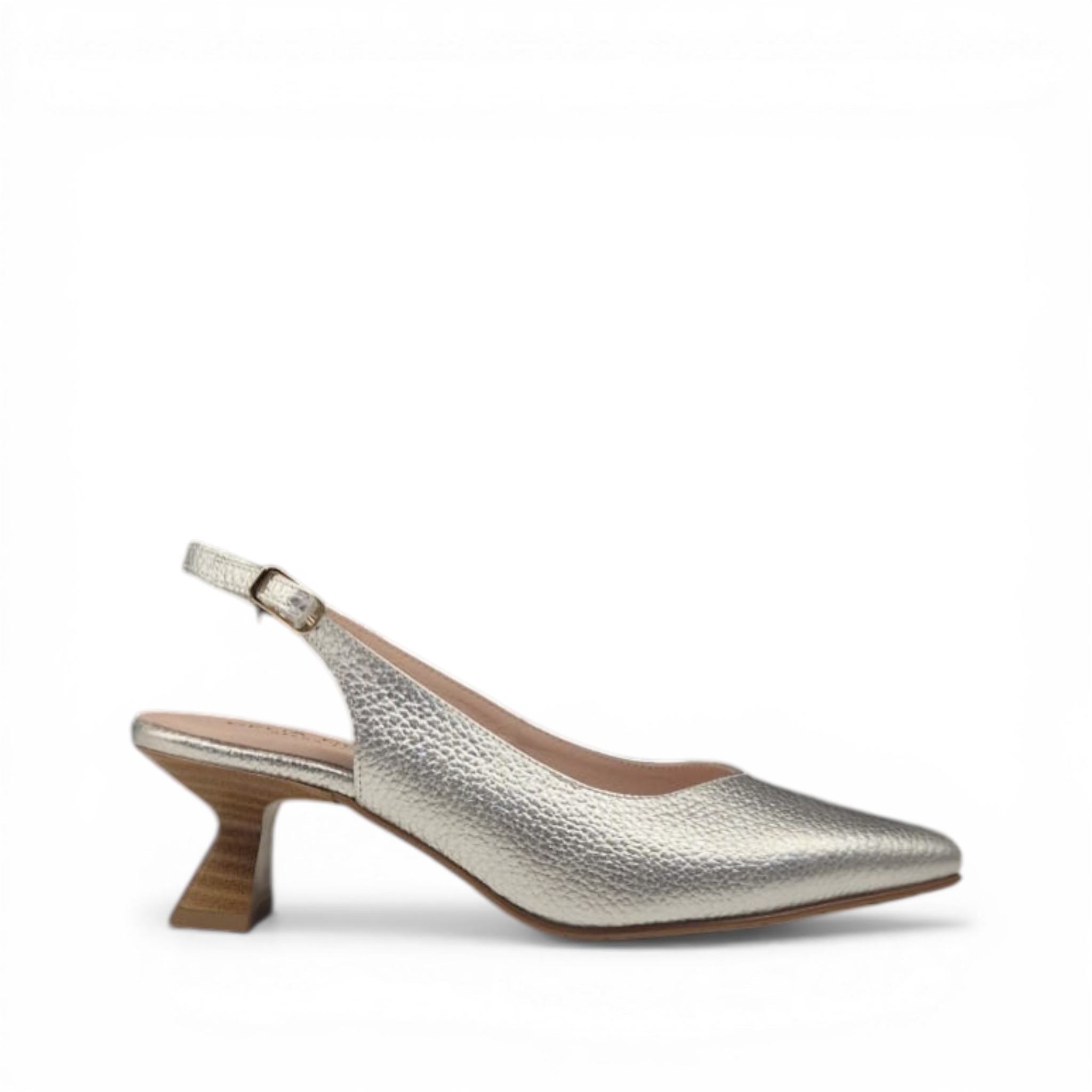 Salón de la marca Celia, hecho a mano en España, de piel de color oro metalizado. Cierre con hebilla, y tacón de 5 cm.