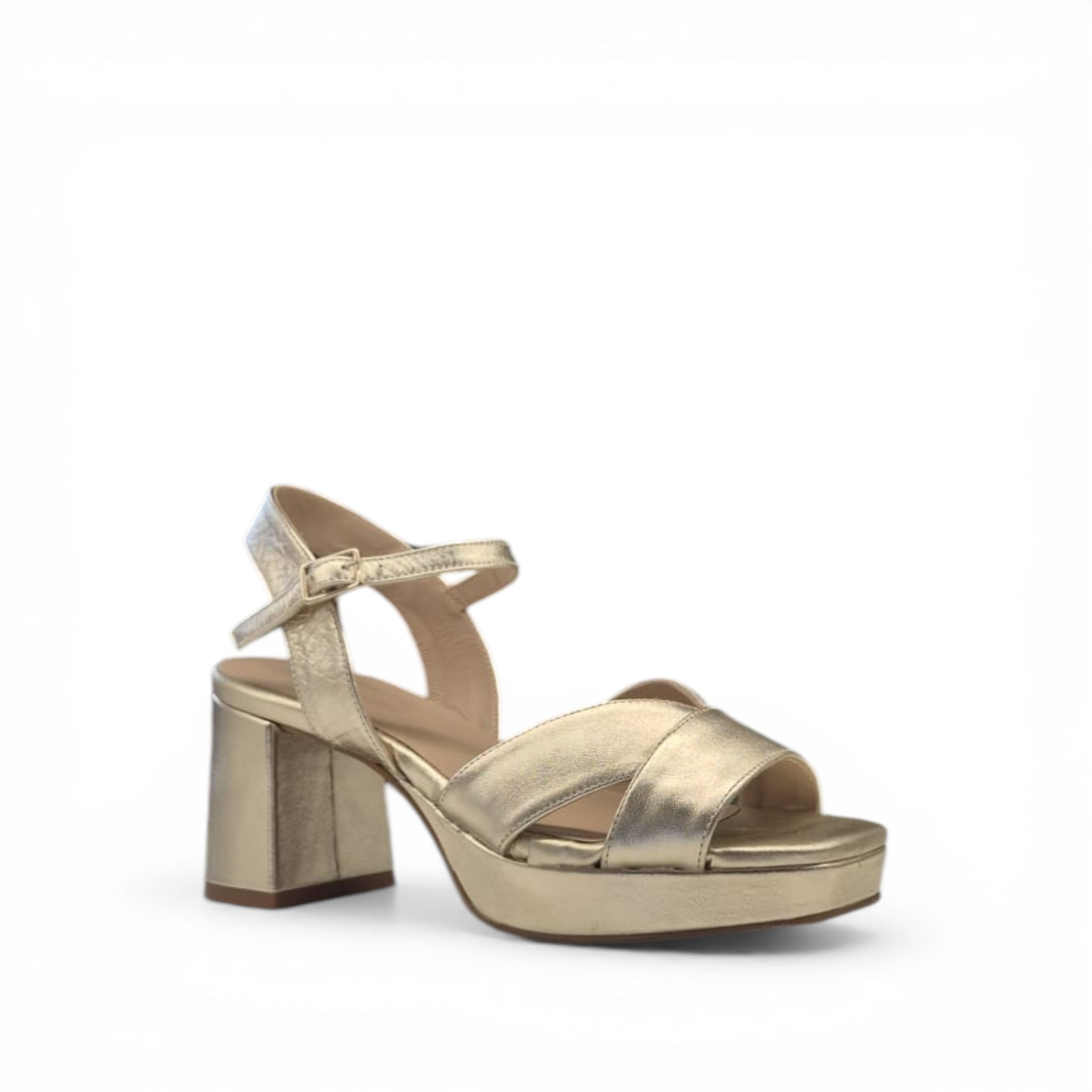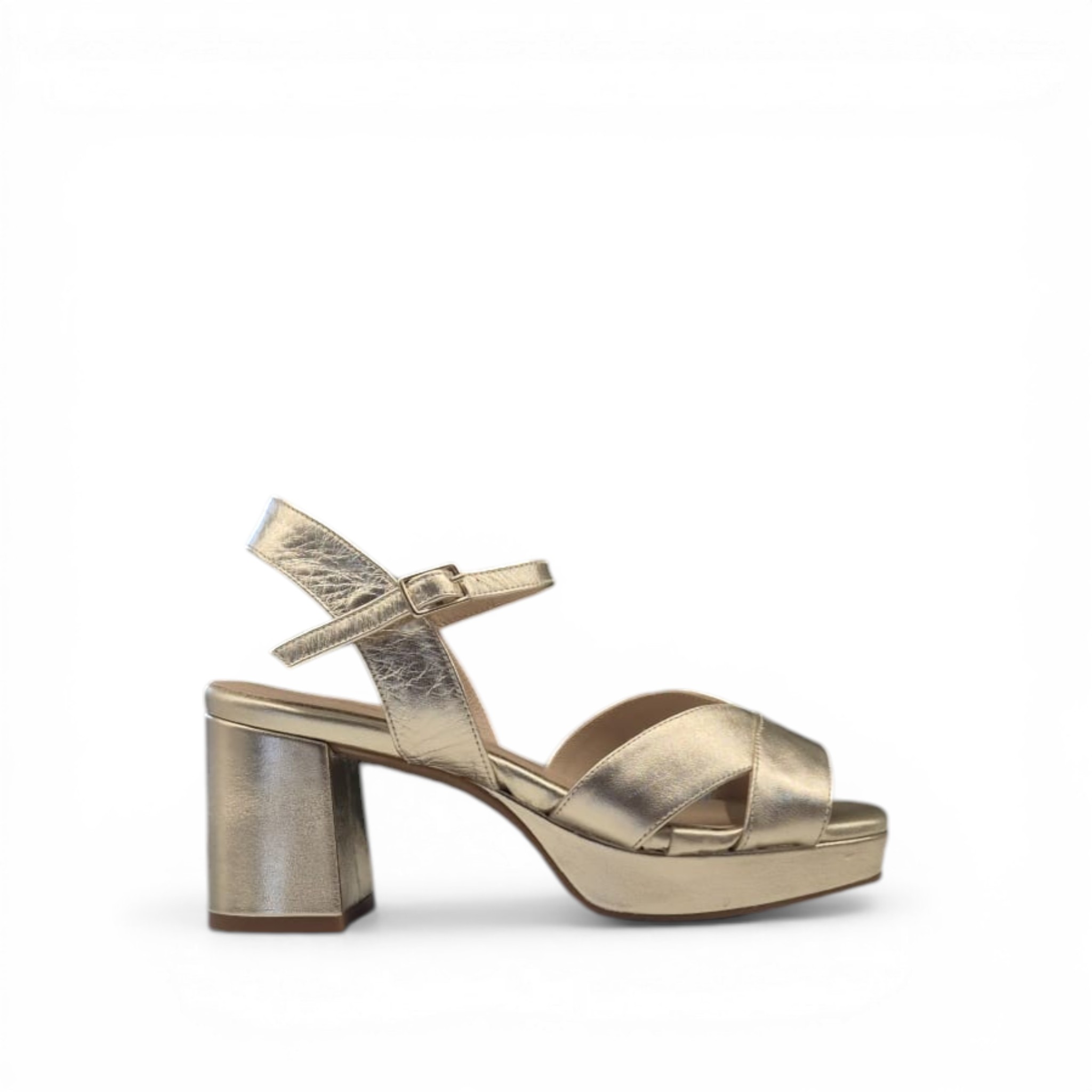 Sandalia de tacón medio con plataforma de la marca Dansi, hecha a mano en España, de color oro metalizado.