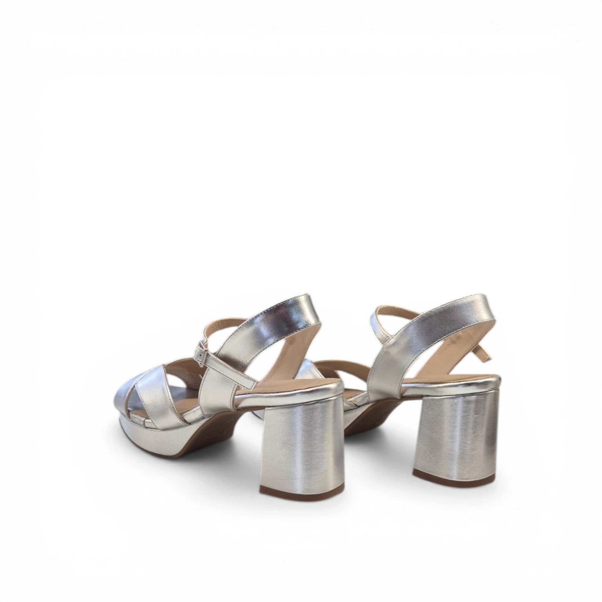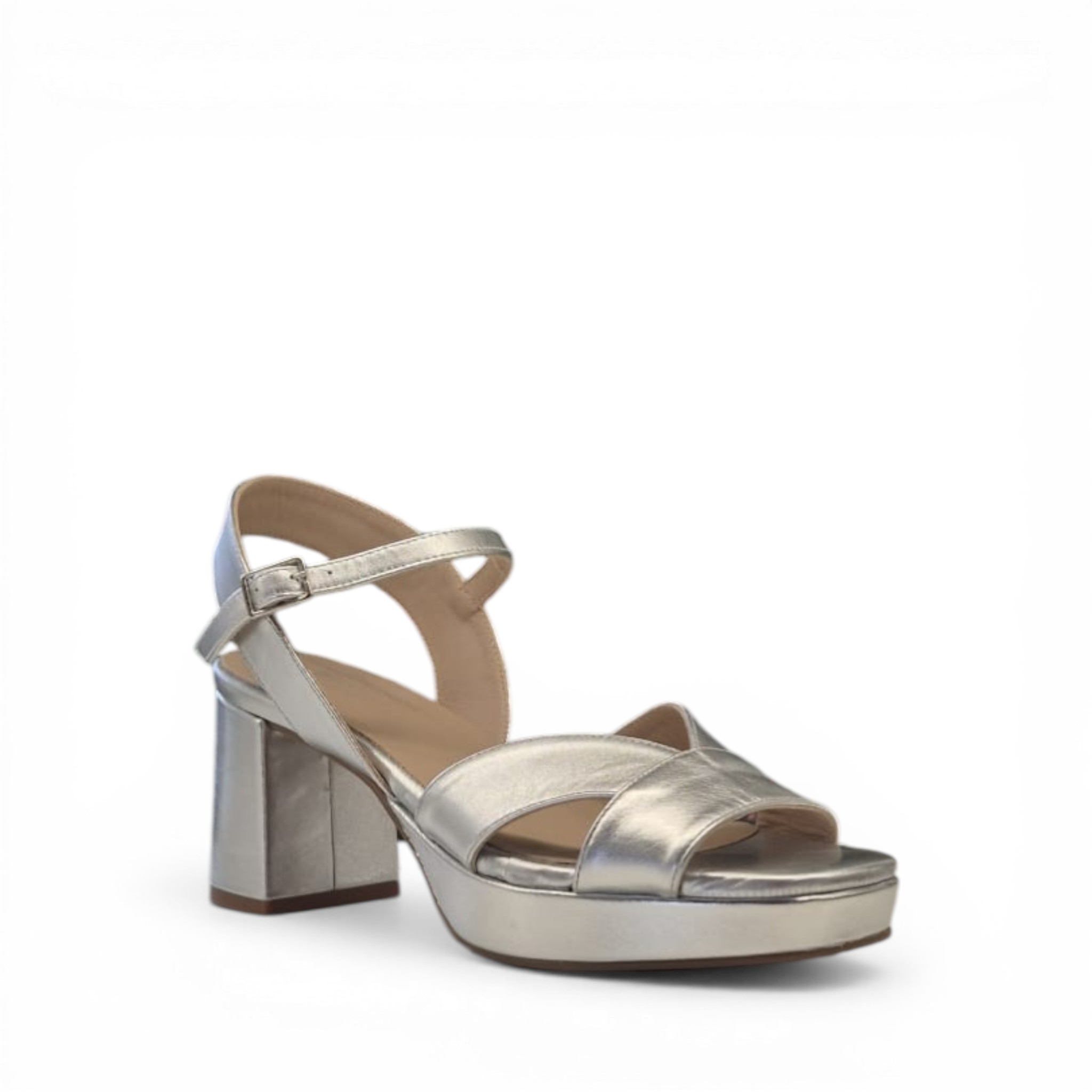 Sandalia de tacón medio con plataforma de la marca Dansi, hecha a mano en España, de color plata metalizado.