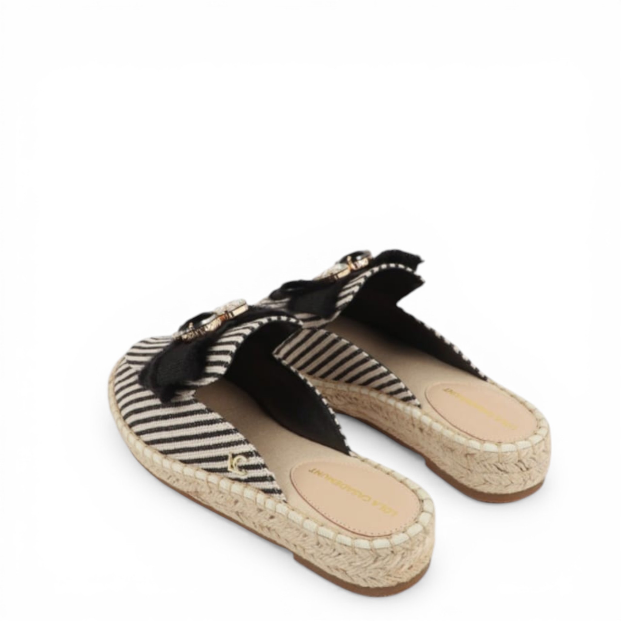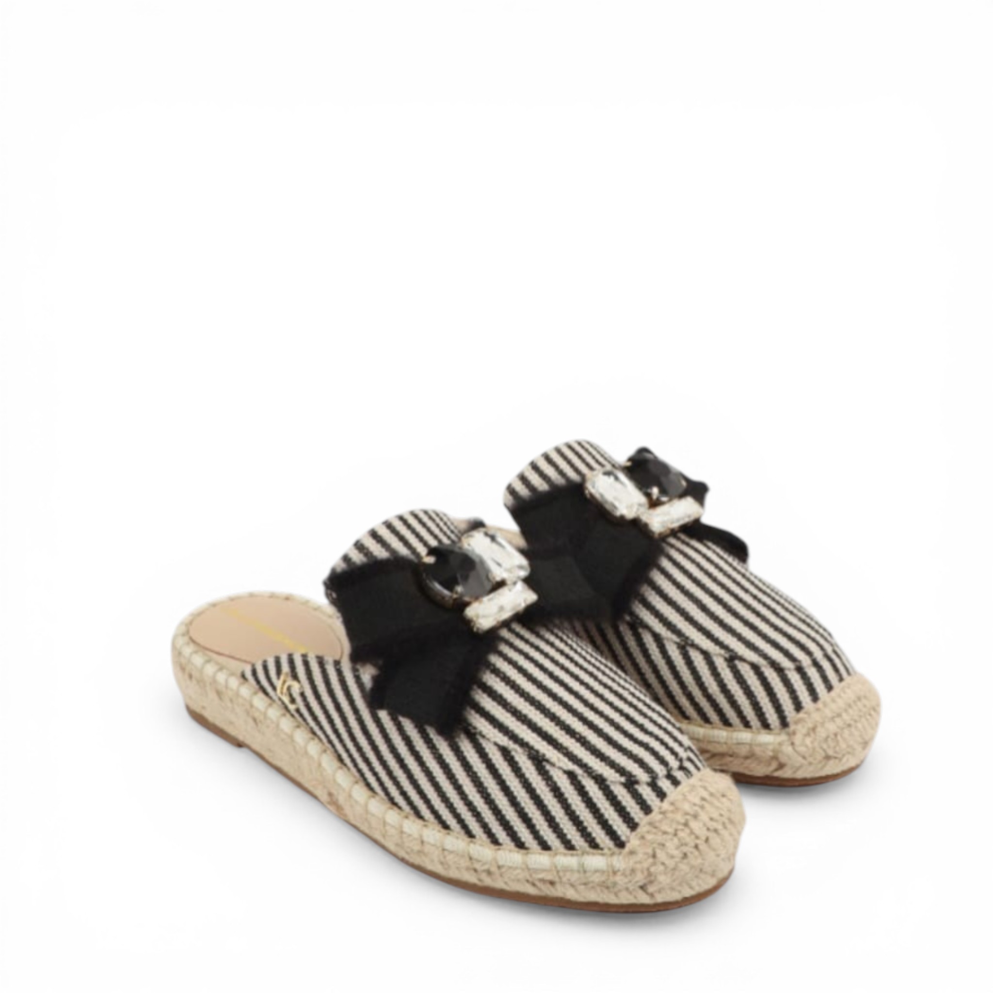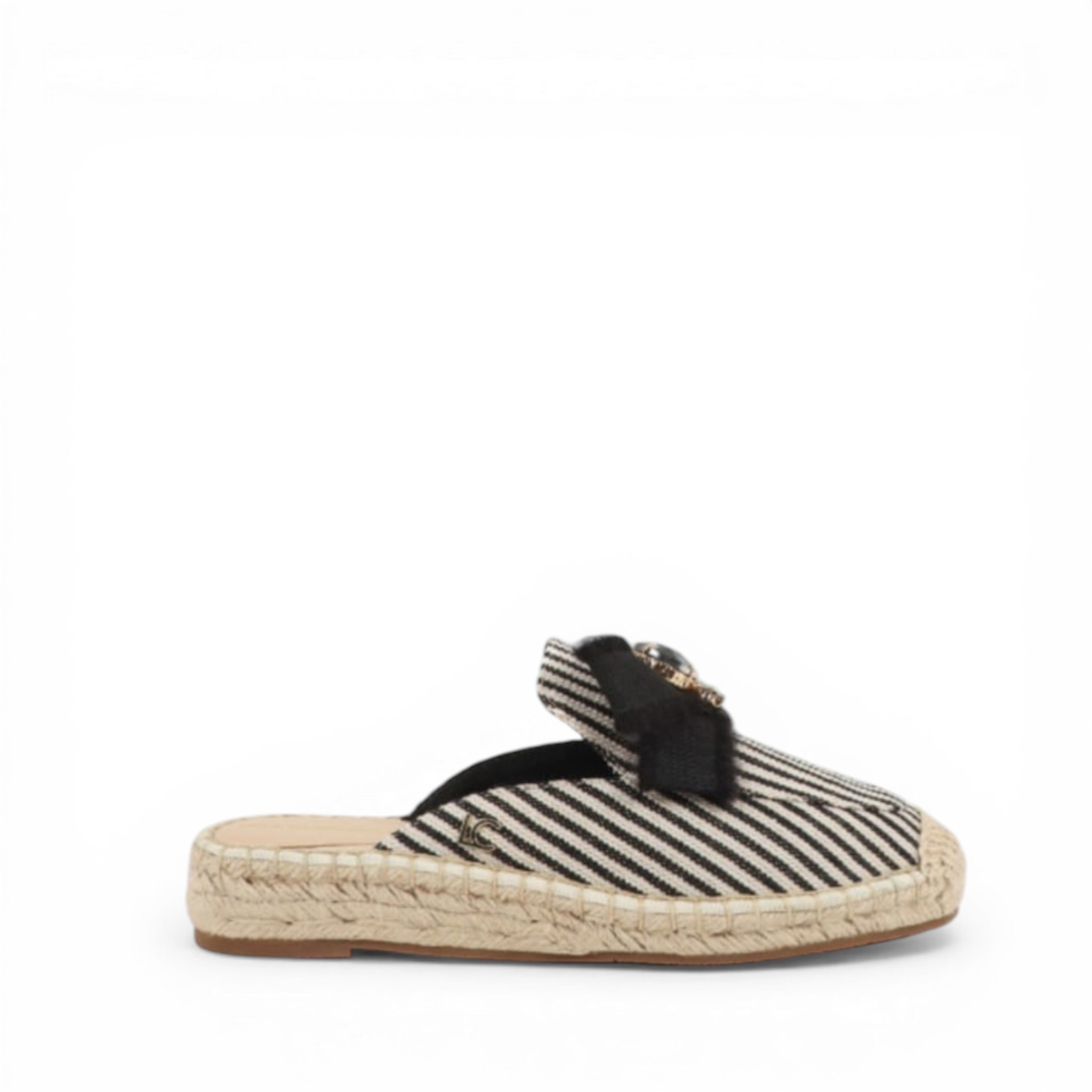 Sandalia plana con suela efecto rafia de la marca Lola Casademunt, con tejido en color blanco y negro y lazo con apliques decorativos. Material Textil.