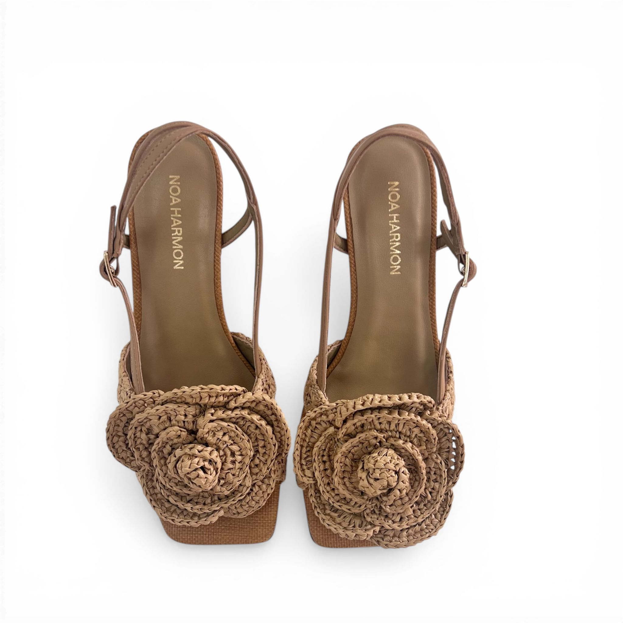 Sandalia de la marca Noa Harmon, detalles en rafia color crudo plantilla en piel.