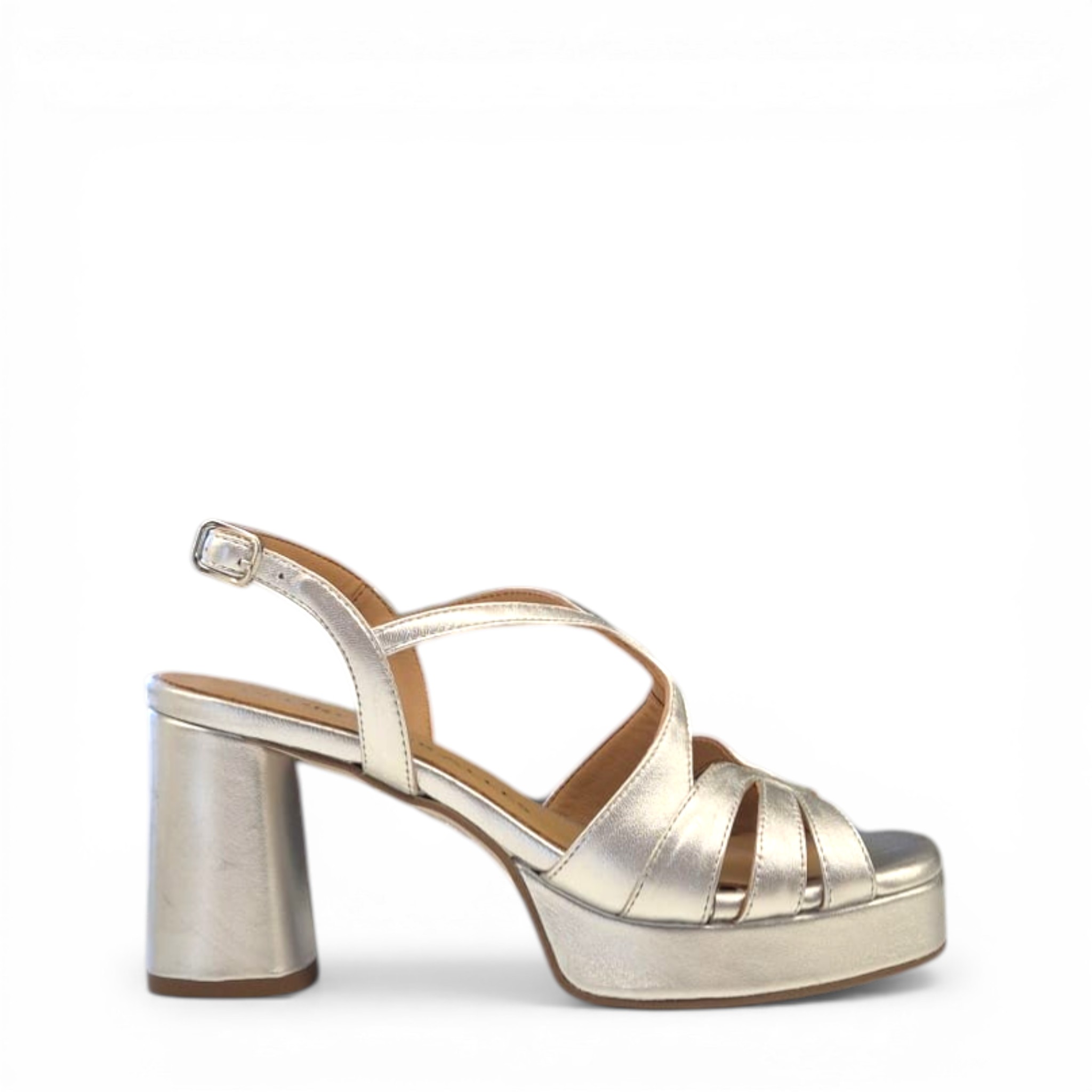 Sandalias de tacón de piel de color plata de la marca Pedro Miralles, hecha a mano en España.