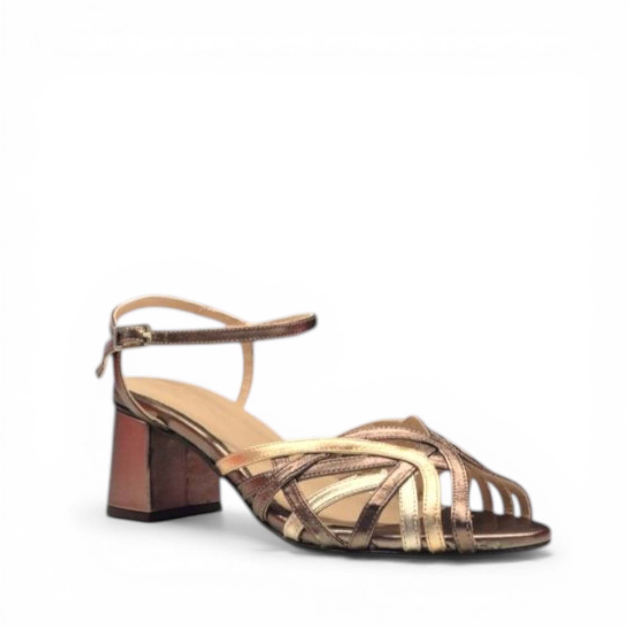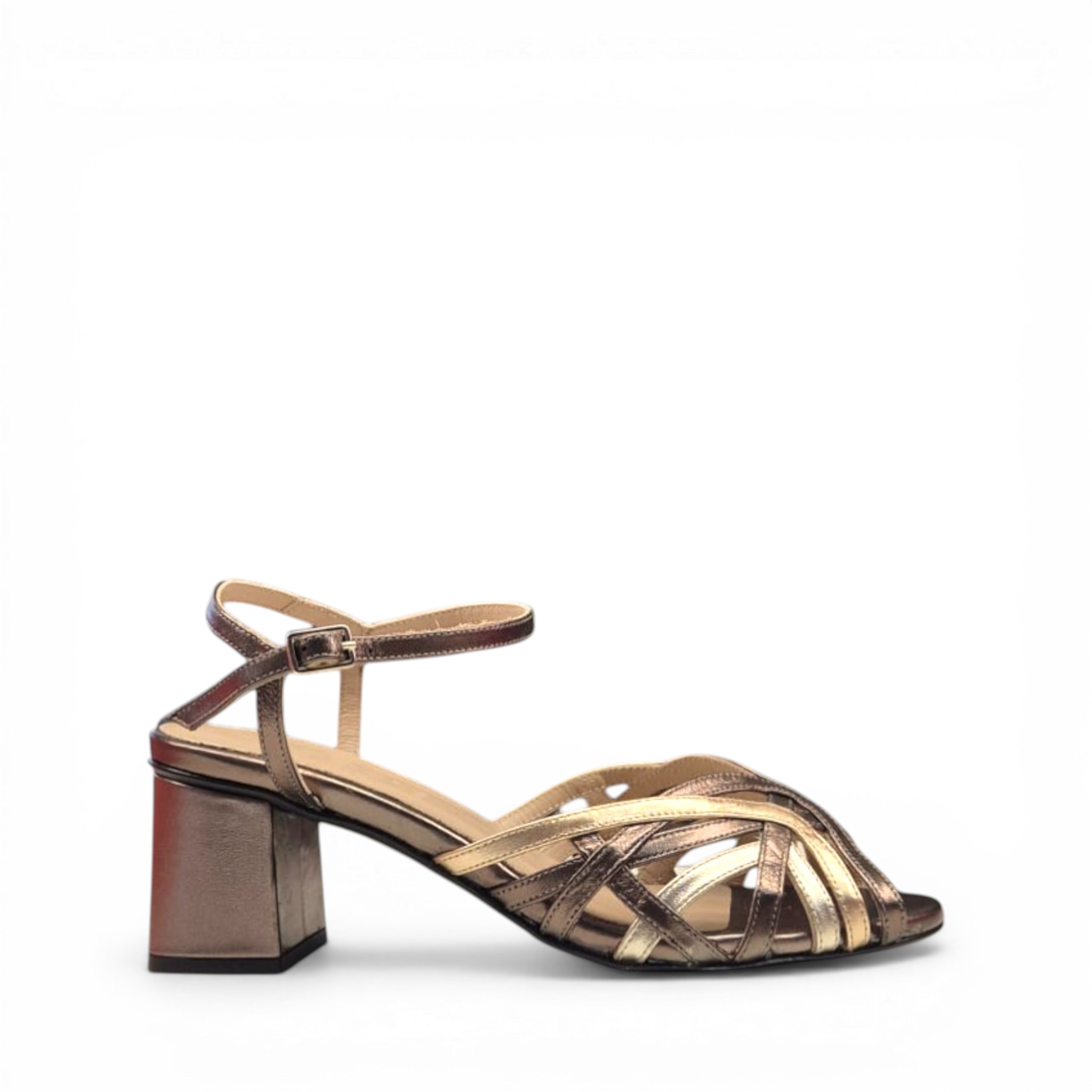 Sandalia de tacón medio, hecha a mano en España, de la marca Dansi fabricada con piel de color bronce combinado con color oro y plata.