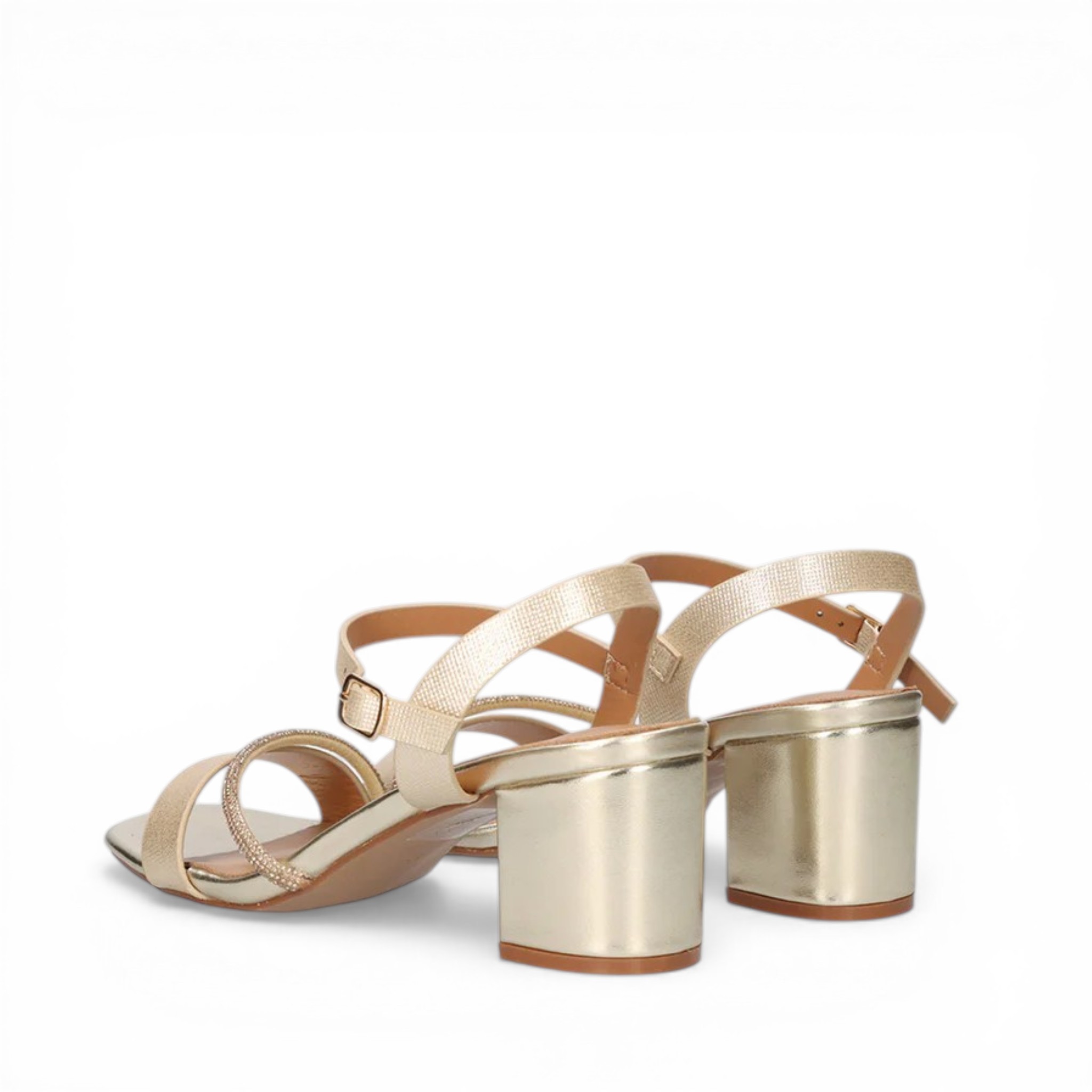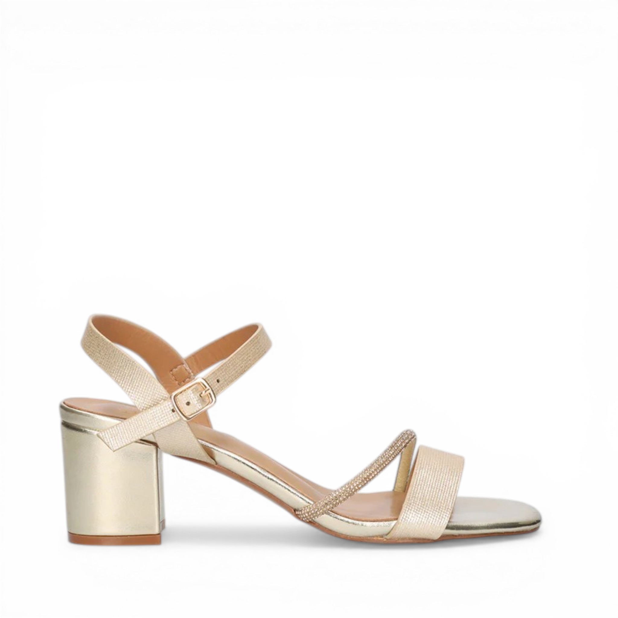 Sandalia de la marca Exé, de color oro cuenta con un tacón ancho de 6 cm de altura y cierre en forma de hebilla al tobillo. Material Plantilla de piel.