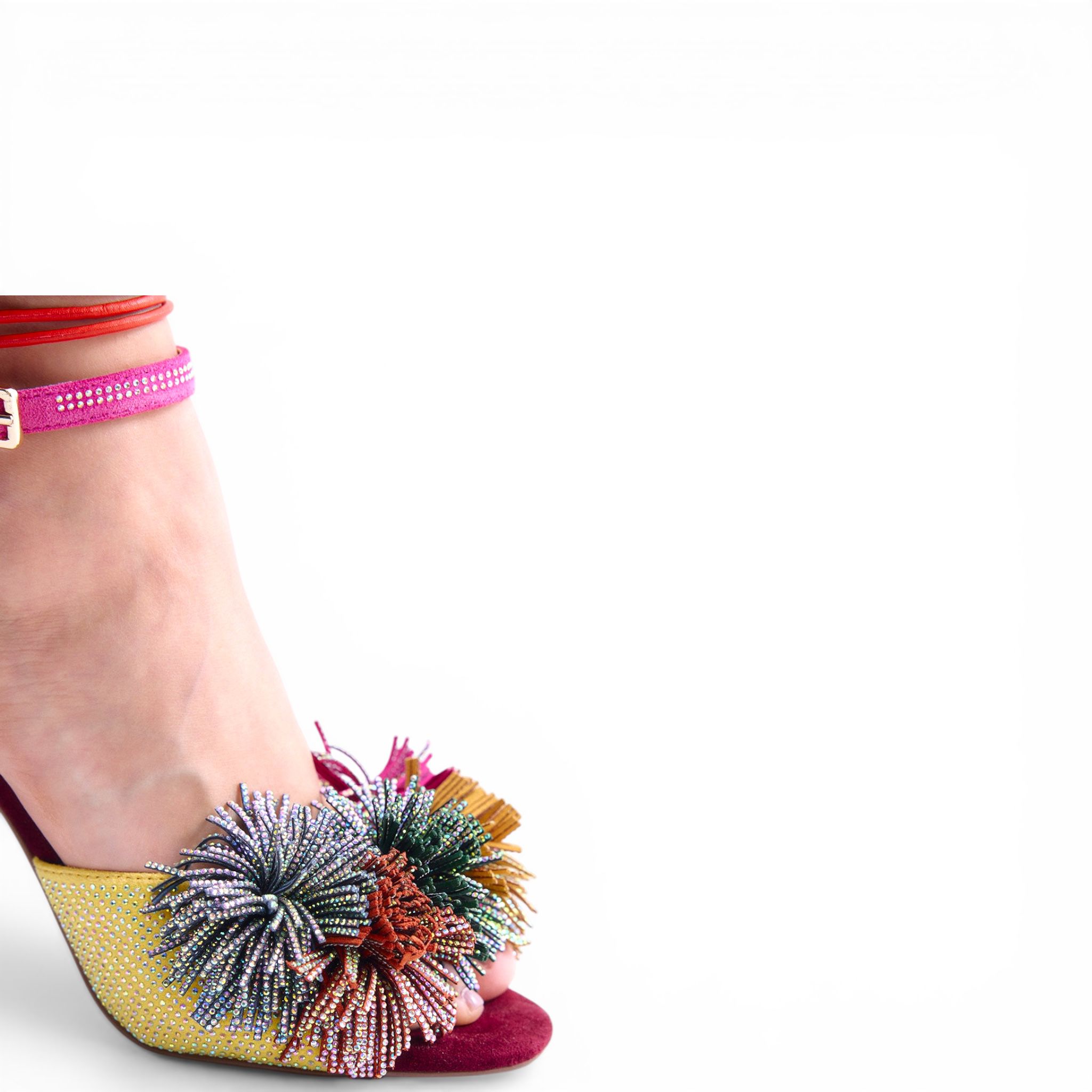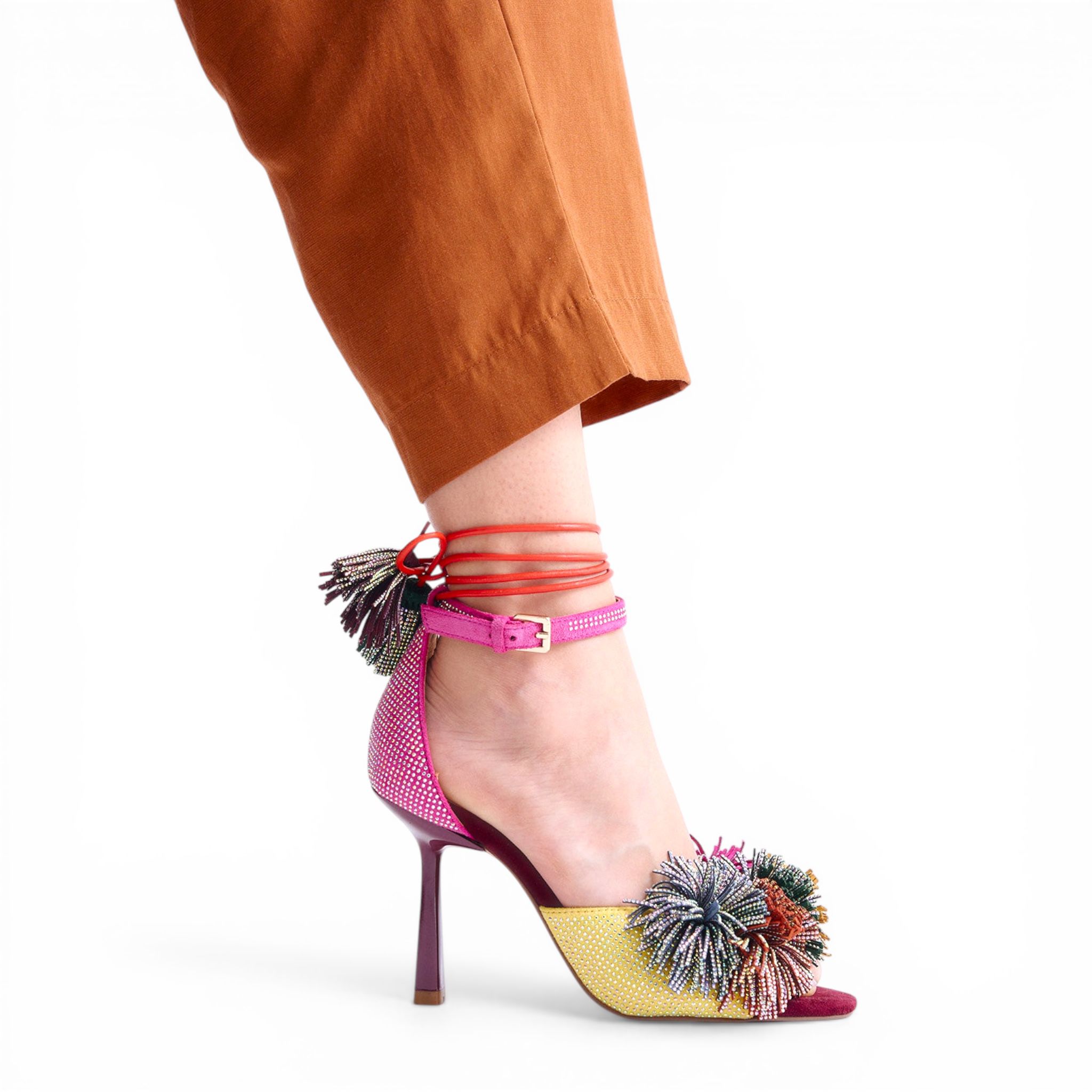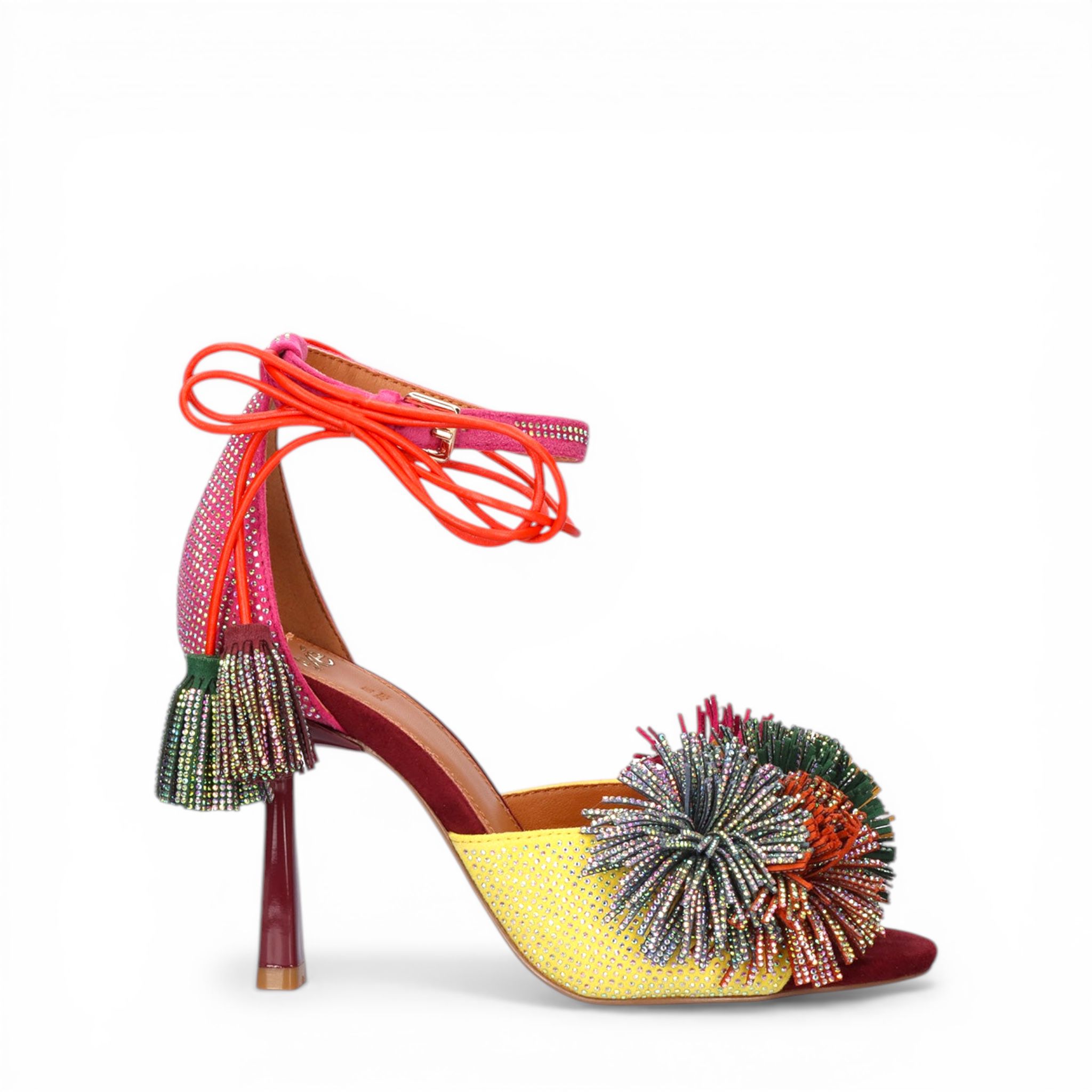Sandalias de tacón de la marca Exé combina tonos rosa y amarillo con tacón de color burdeos y detalles de pompones. Plantilla de piel. Cierre con cordones y cierre de hebilla. Tacón: 9 cm