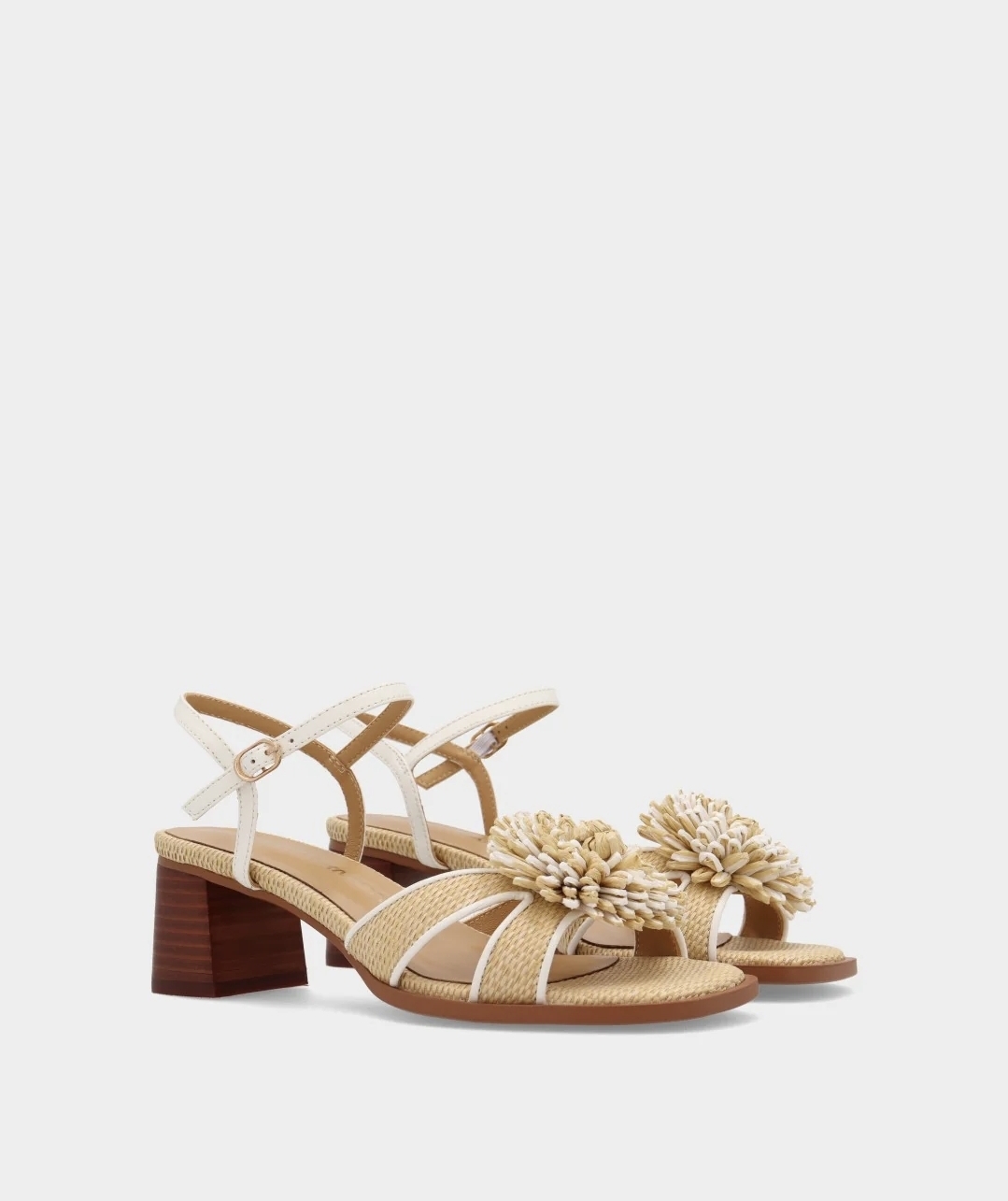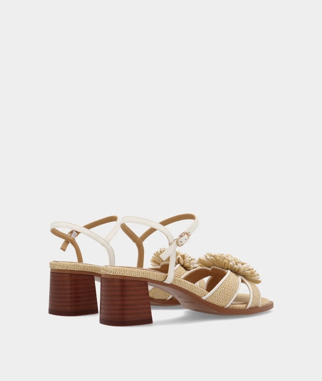 Sandalia de tacón medio de la marca Noa Harmon, de piel con adorno floral de rafia en el empeine. Cierre de hebilla y tacón de 5 cm.