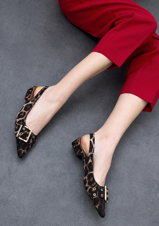Zapato plano con diseño de tiras y hebillas personalizadas. Acabado en print animal para un look audaz. Ideal para combinar con atuendos casuales o de oficina.