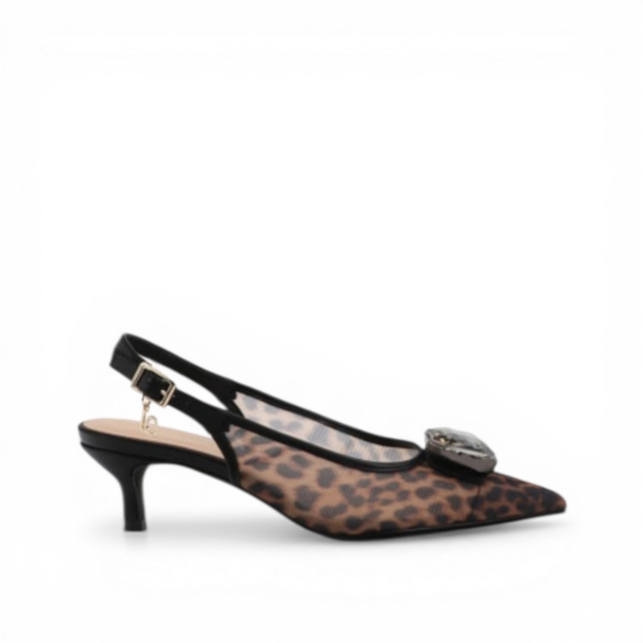 Zapato de tacón elegante con print animal y diseño en rejilla translúcida. Destacado detalle de cristal en la puntera y cierre con hebilla ajustable. Ideal para destacar en ocasiones especiales.